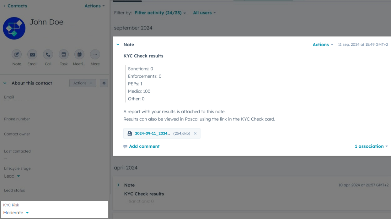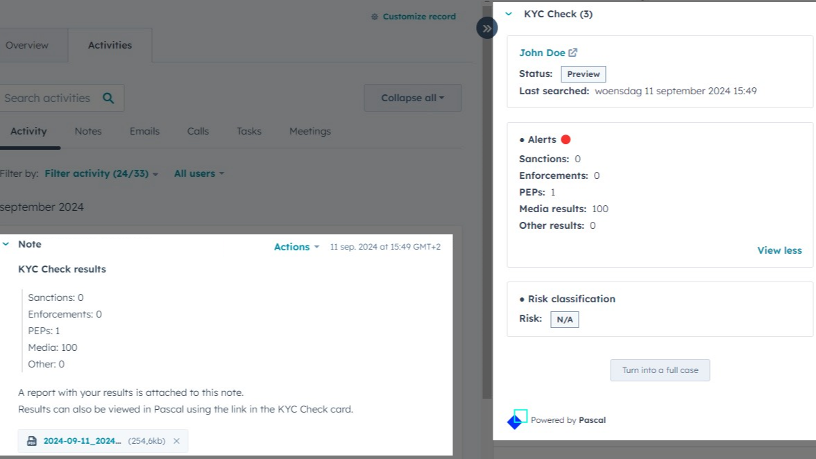 Initiate KYC checks effortlessly by pressing the “Create case” button, or set up automatic checks in the integration settings for seamless screening of your contacts as soon as they are created. Pascal provides a detailed list of screening results within the app card and attaches them as notes to the contact or company page for easy reference.