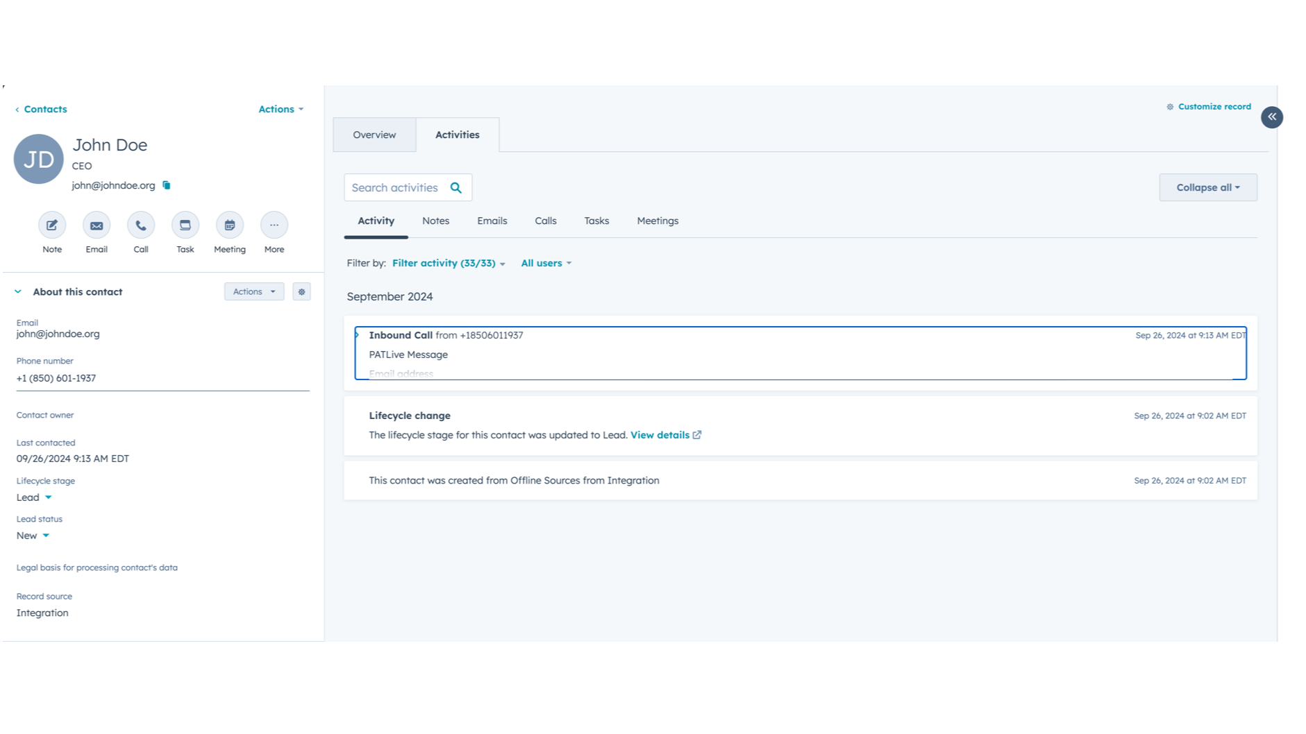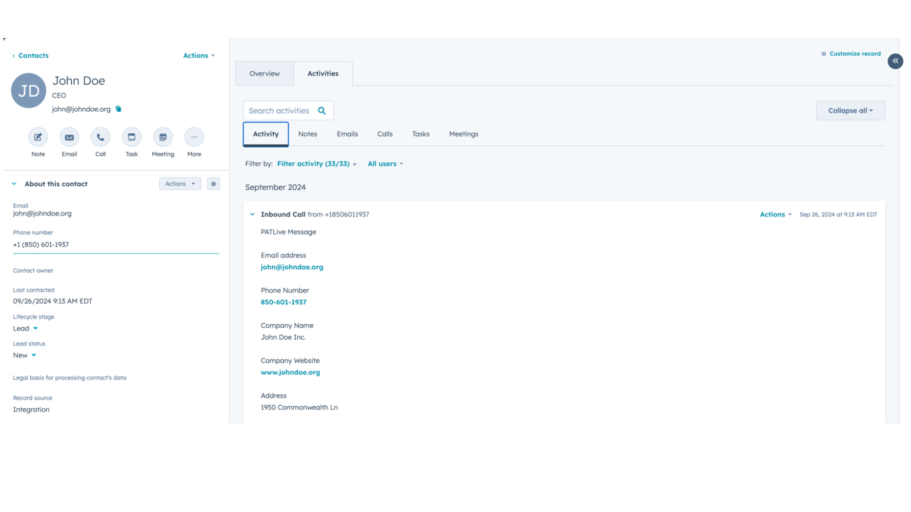 After each call, PATLive will automatically add an Activity Record to reflect the conversation and store that record directly on the HubSpot Contact.