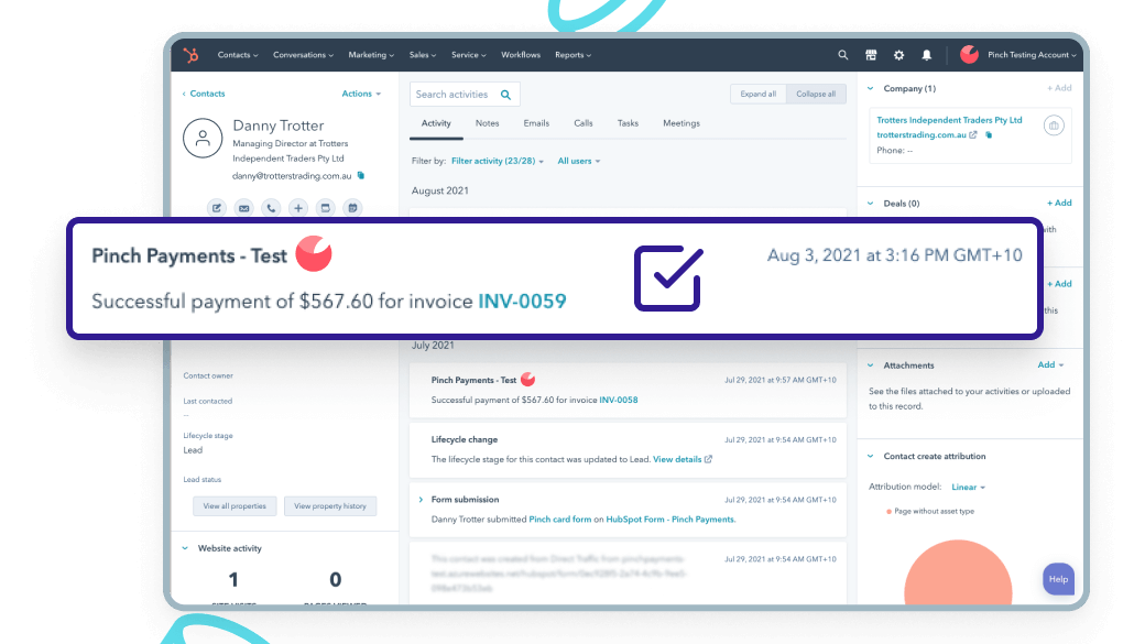 Whenever Pinch processes a payment, HubSpot will be notified in realtime of the payment attempt. Both successful and failed payments are shown on the contact record.