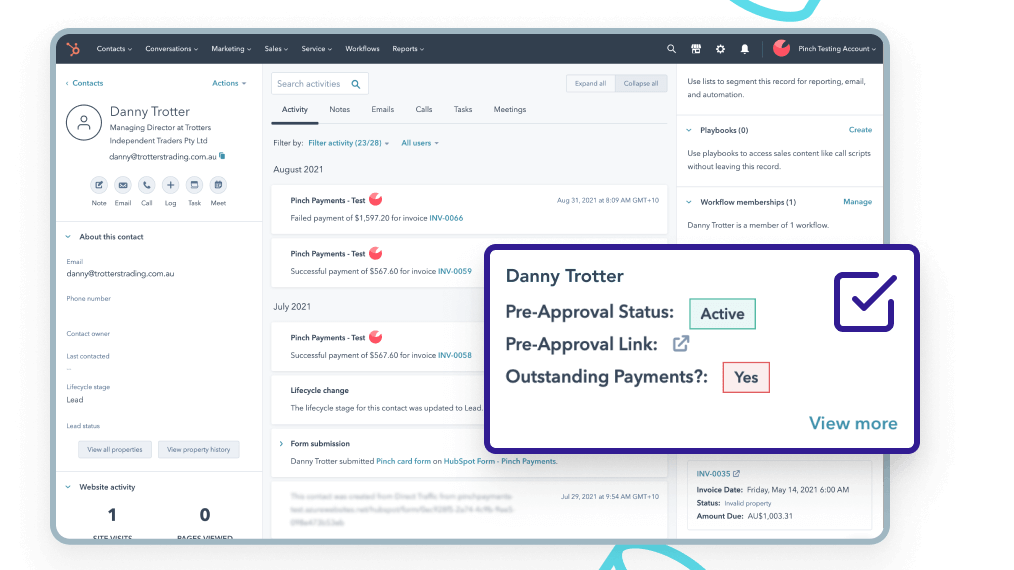 With Pinch, each of your contacts will show an overview within the HubSpot record. We record whether the contact has outstanding payments, has signed into a pre-approval and details on how much the owe and have paid. A full overview now awaits each account manager!