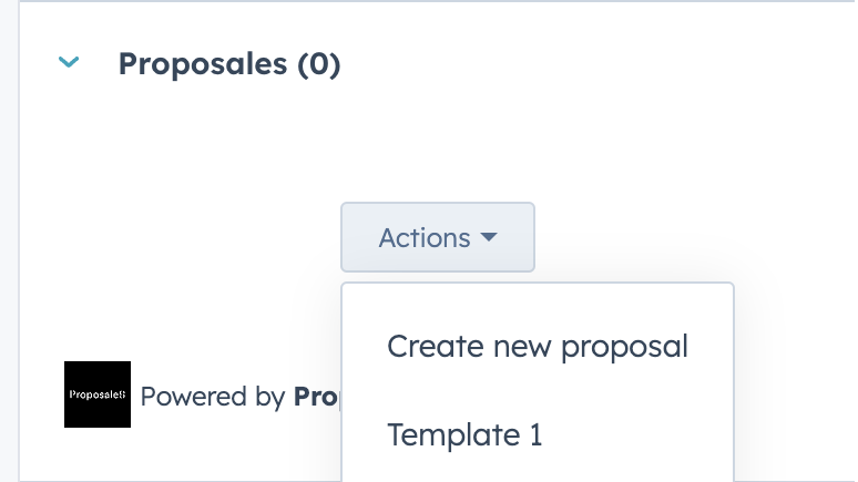Create a proposal via the "Actions" button in the Proposales panel, next to the deal. Pick one of your proposal templates, or create a new proposal from scratch.