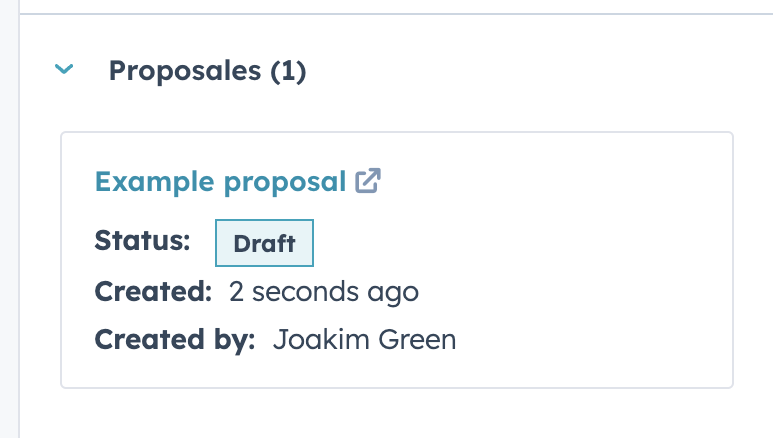 A proposal draft will show up in the Proposales panel, so that you can quickly navigate to it by clicking the link to the draft in Proposales. The recipient will automatically be added from the Contact person (and company) associated with the deal in HubSpot.
