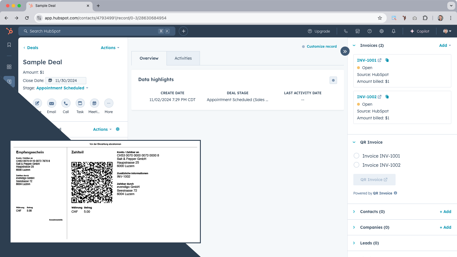 After creating a deal, you can make an invoice within HubSpot. The official's Knowledge base entry describes how to do it. After creating an invoice, the documents are provided without an invoice slip. The "QR Invoice" app takes all the information from the invoice and generates an official Swiss QR invoice on the fly. No data or invoices are stored somewhere else.