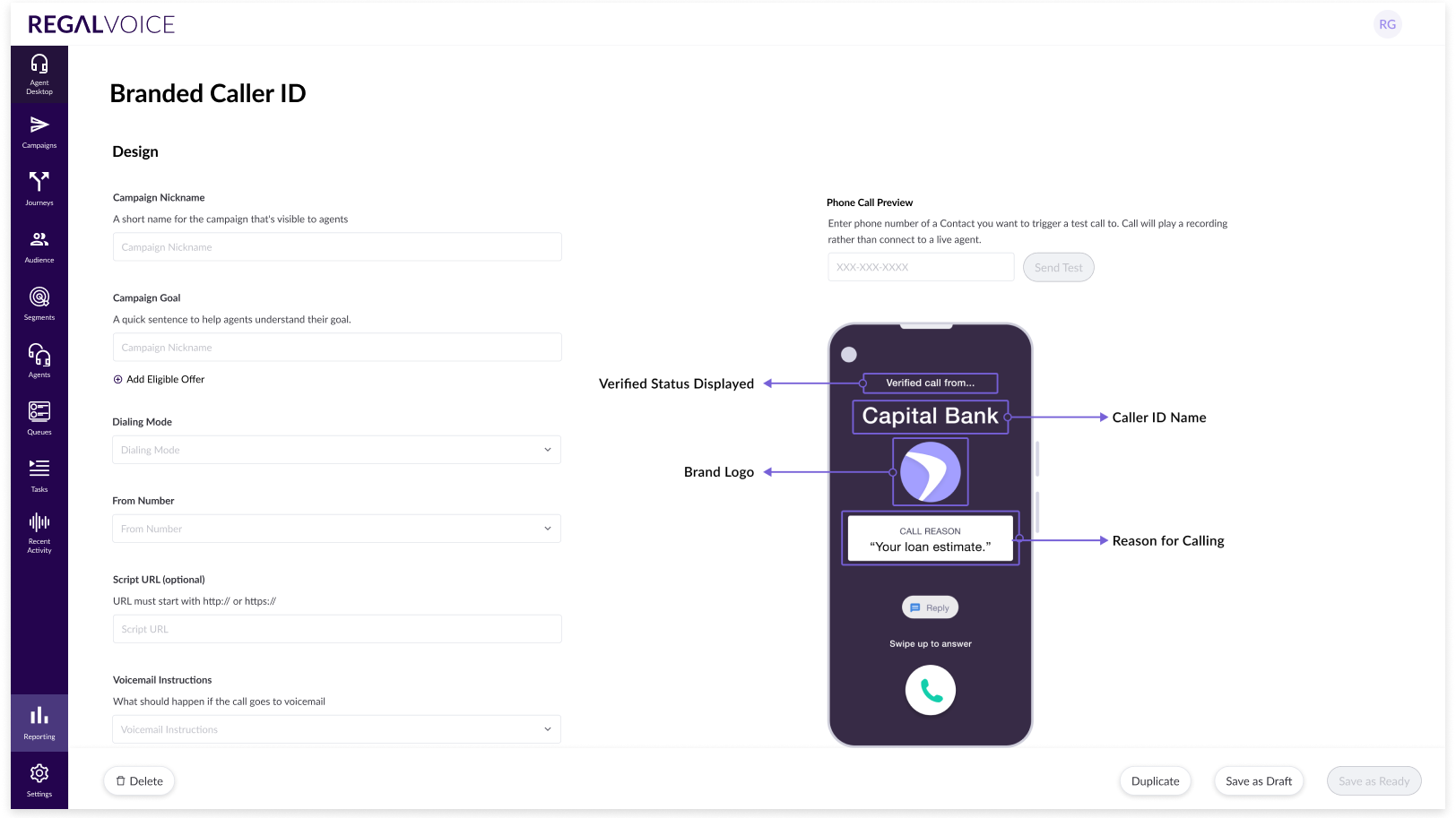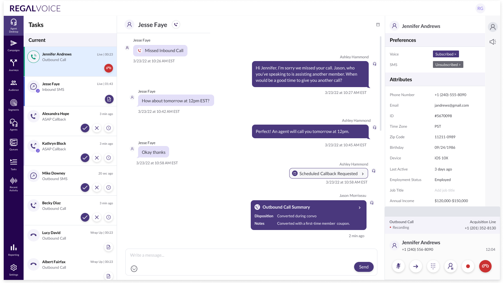 The Regal Voice agent desktop is where your sales agents can place and answer calls, exchange texts with customers and see all the relevant customer profile data to help customers move forward in your funnel and make a purchase.