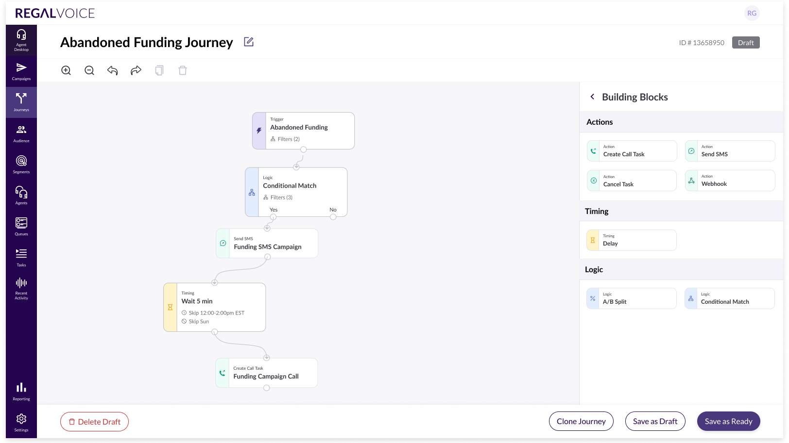 Build cross-channel journeys in Regal Voice that personalize each customer's experience based on their own behaviors and deal or contact events from HubSpot. A/B test messaging, timing, and frequency of touch points to increase revenue.
