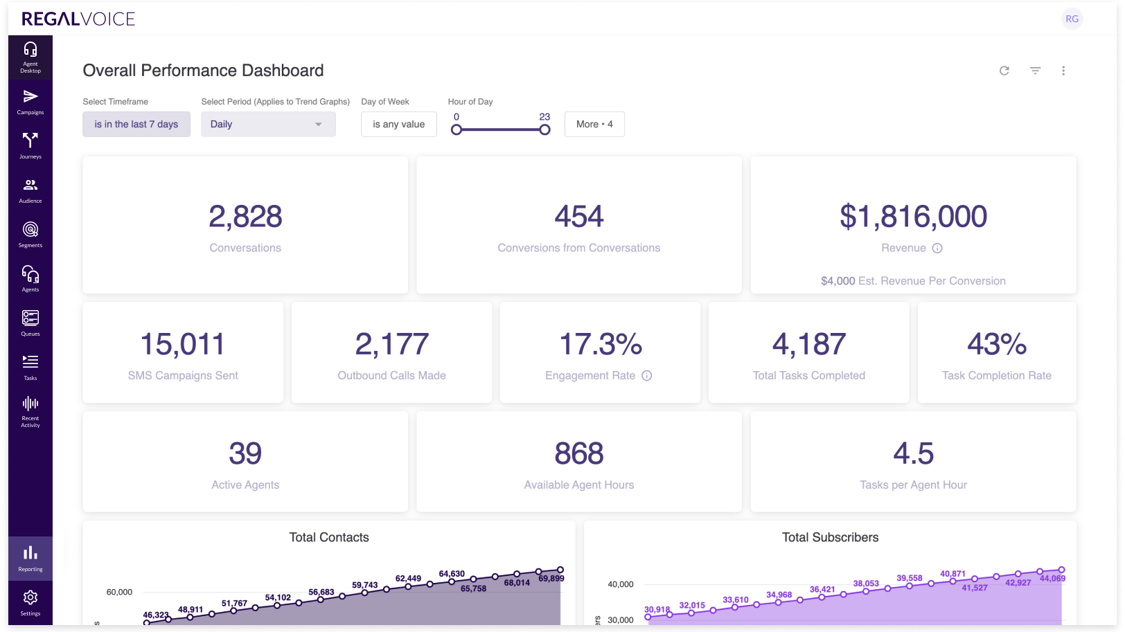 Reporting dashboards in Regal Voice show you how your audience, campaigns and agents are performing - not only in terms of volume and productivity, but also in terms of actual conversions and revenue - and easily identify the levers for growth.