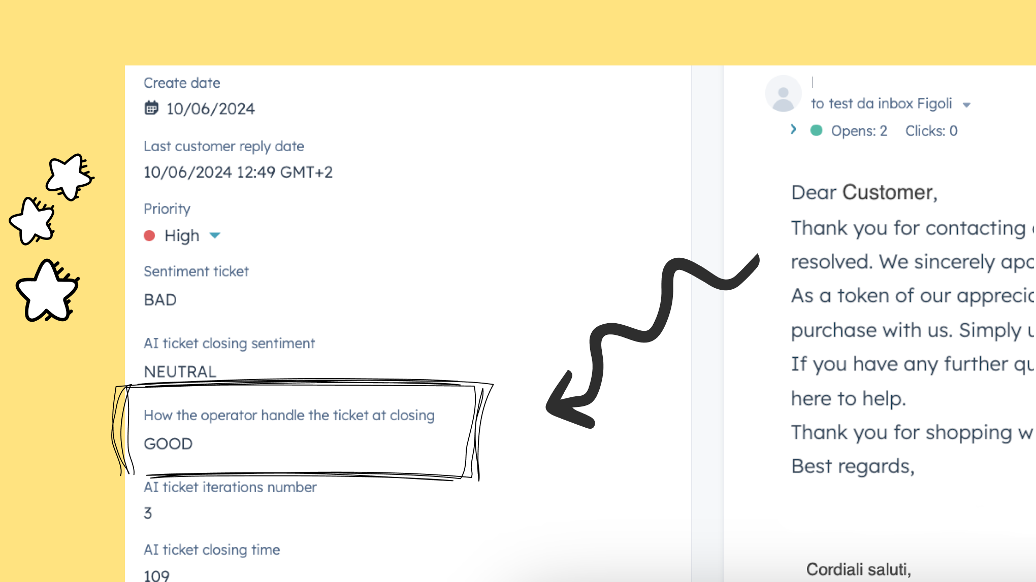 You just need to install the app! When a conversation associated with a ticket enters in HubSpot via email or form submission, the message will be analyzed by AI to provide you sentiment feedback into a ticket property. With a paid plan, you can also have the sentiment at the close of the ticket.