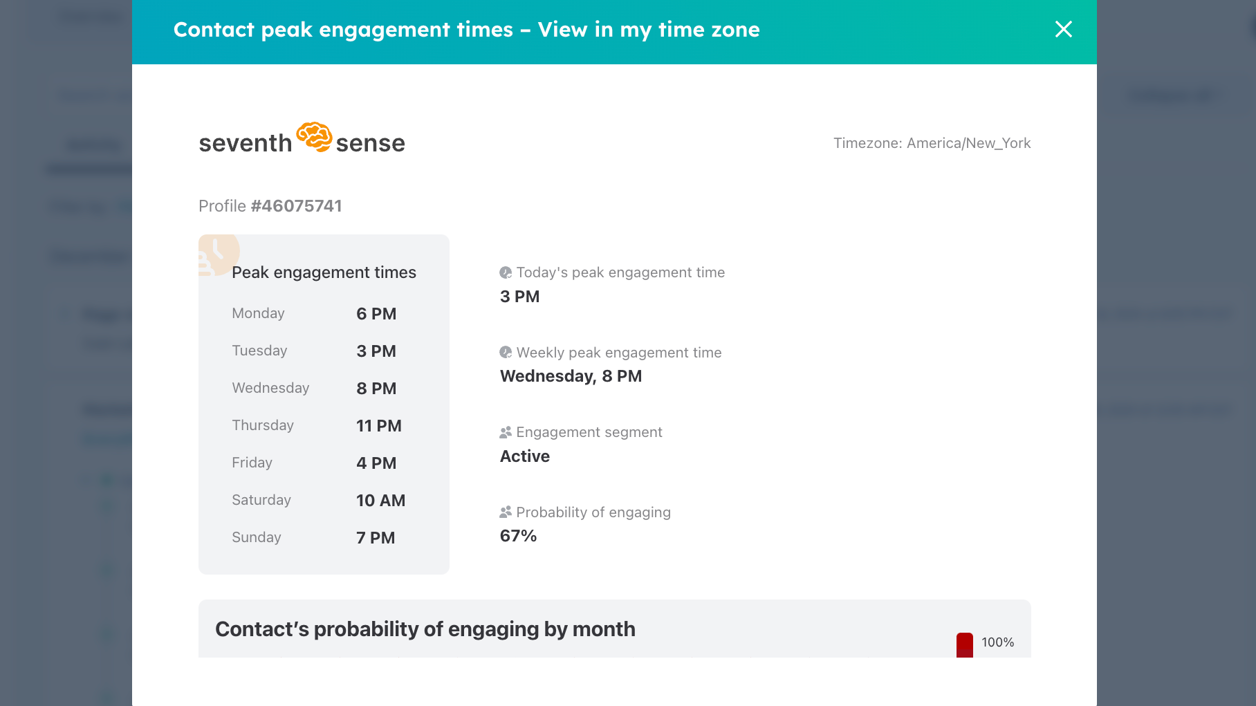 A contact's profile is at the core of the system. EngagementAI uncovers when each person in your CRM is most likely to engage in your emails and what their probability of interacting with your next email send is.
