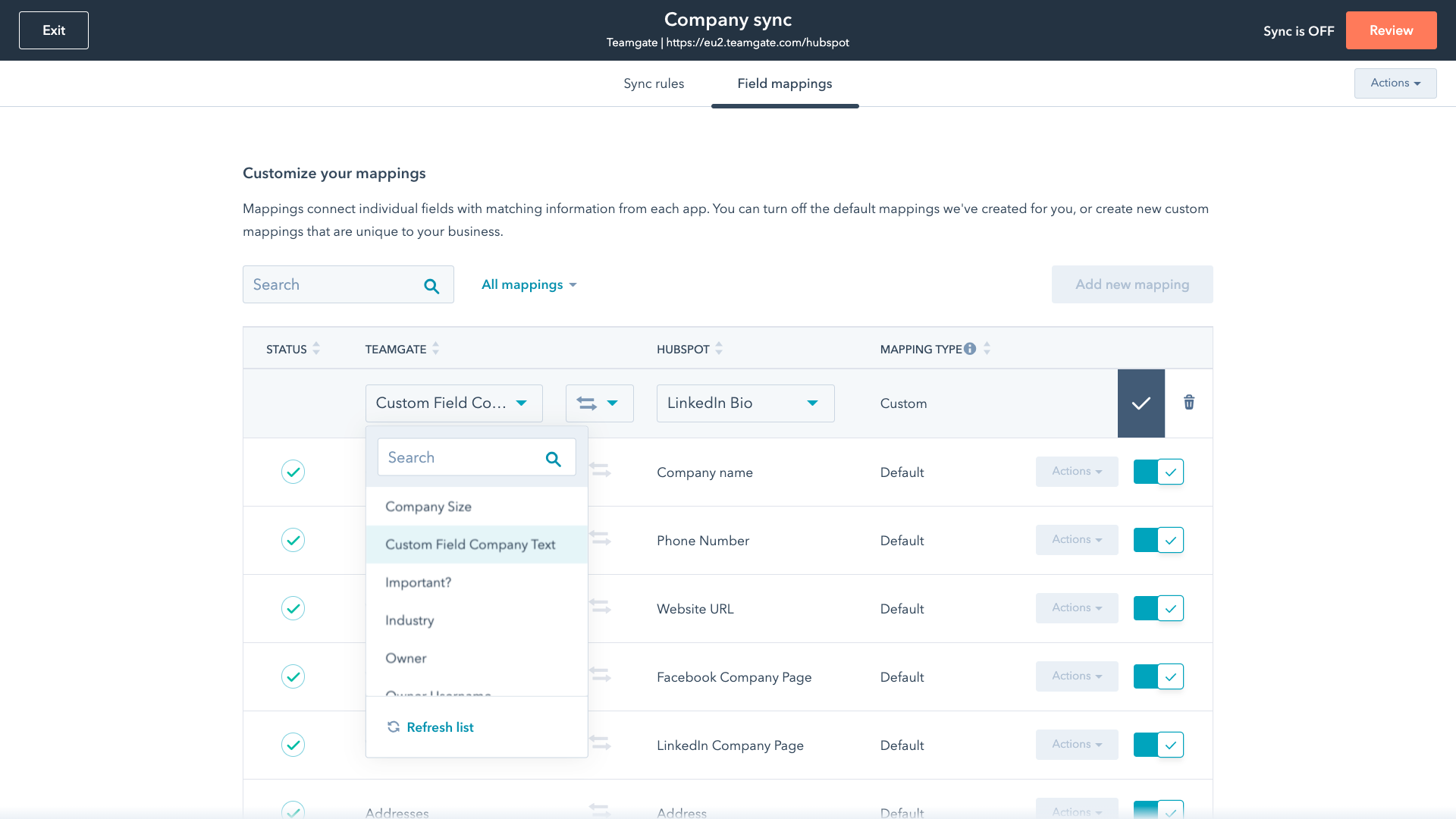 You can set up a one- or two-way sync, which means you can either sync data from Teamgate to HubSpot, from HubSpot to Teamgate, or back-and-forth! Out-of-the-box default field mappings make set-up quick and keep your data clean and organized. Custom field mappings are available with Data Hub Starter or above.