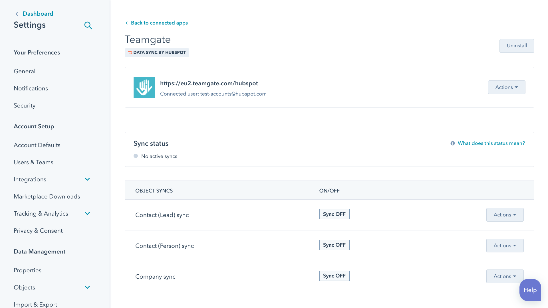 - Two-way sync: Data is shared between Teamgate and HubSpot in real time
