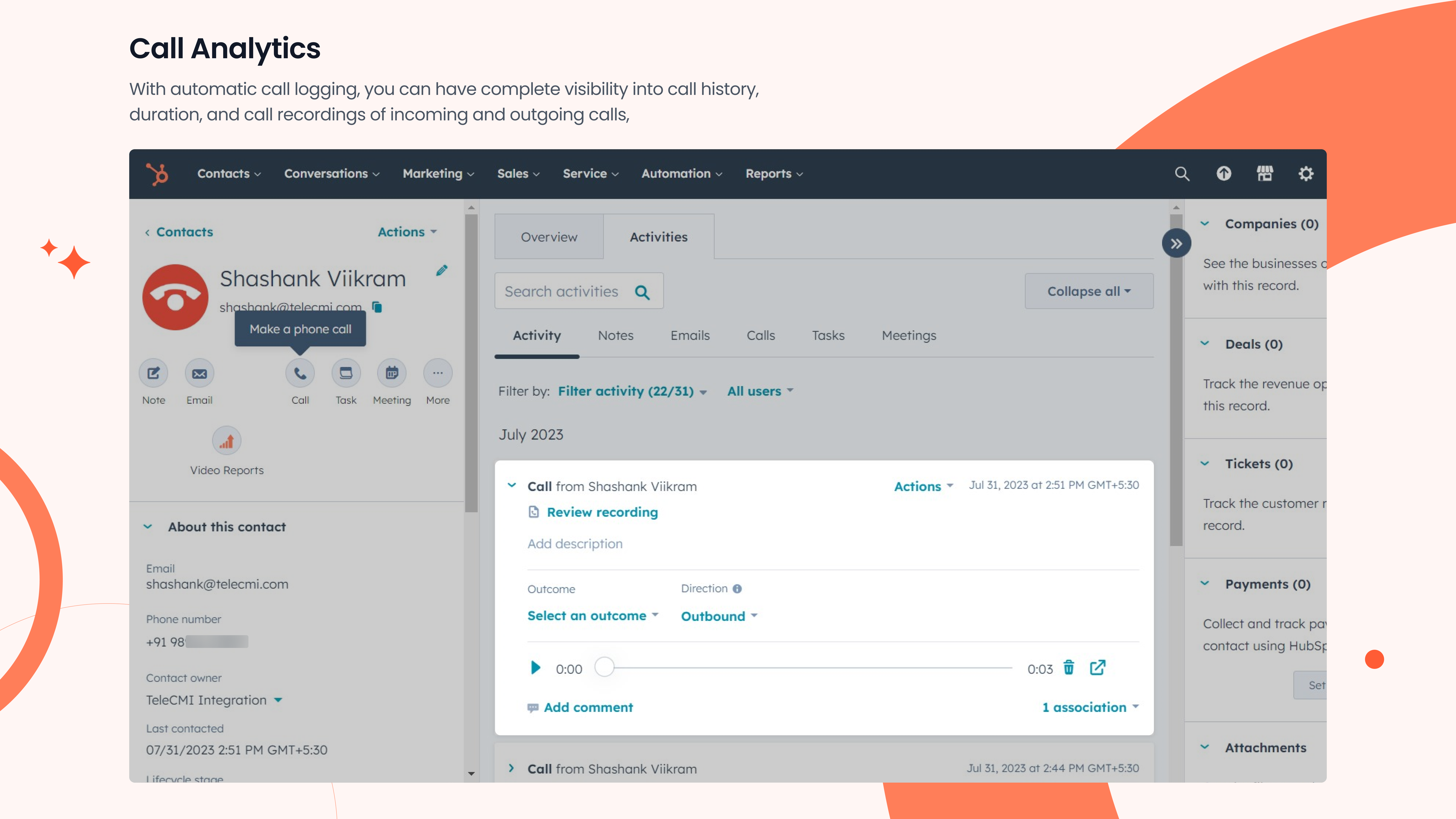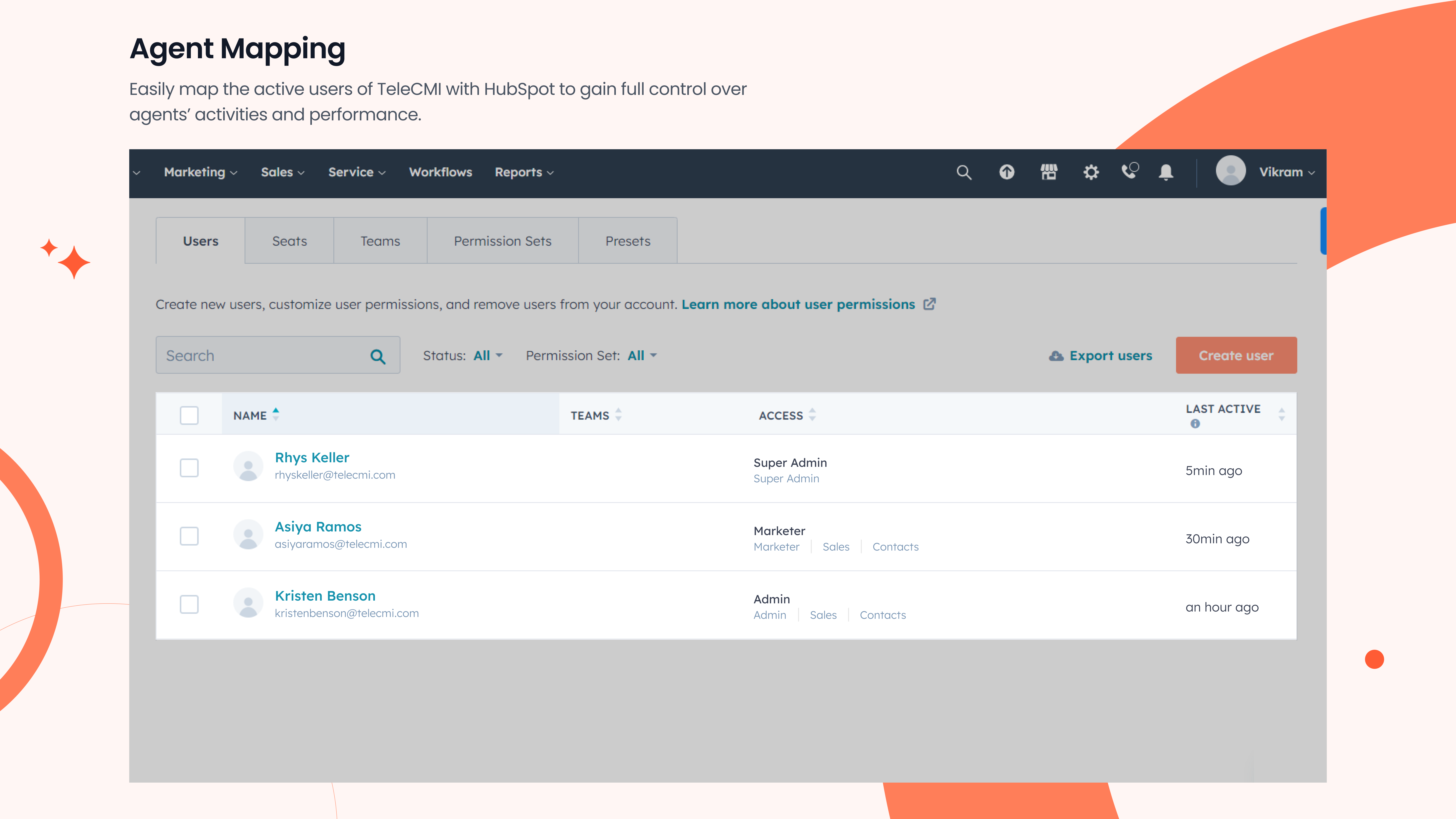 Easily map the active users of TeleCMI with HubSpot to gain full control over agents’ activities and performance.
