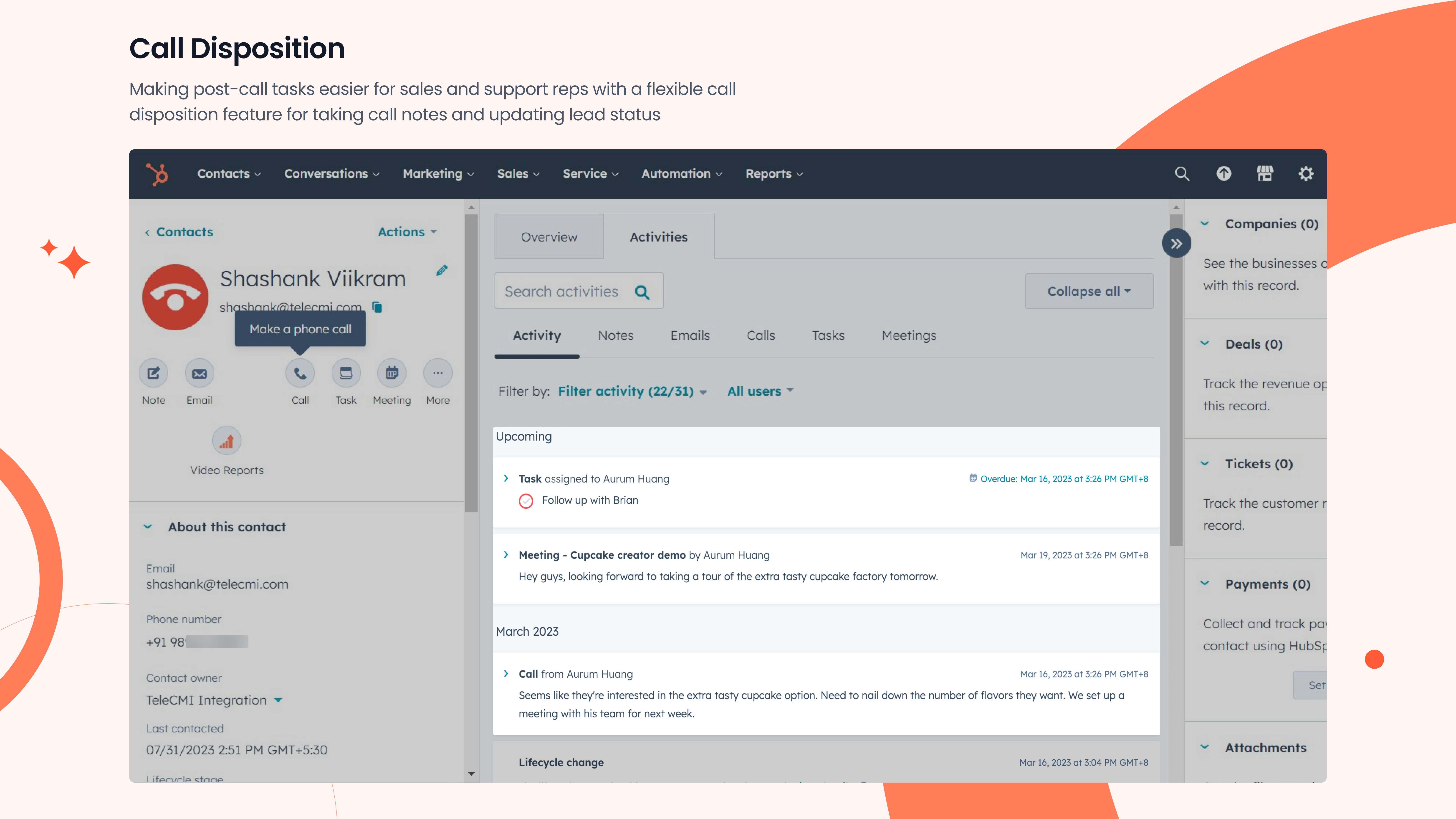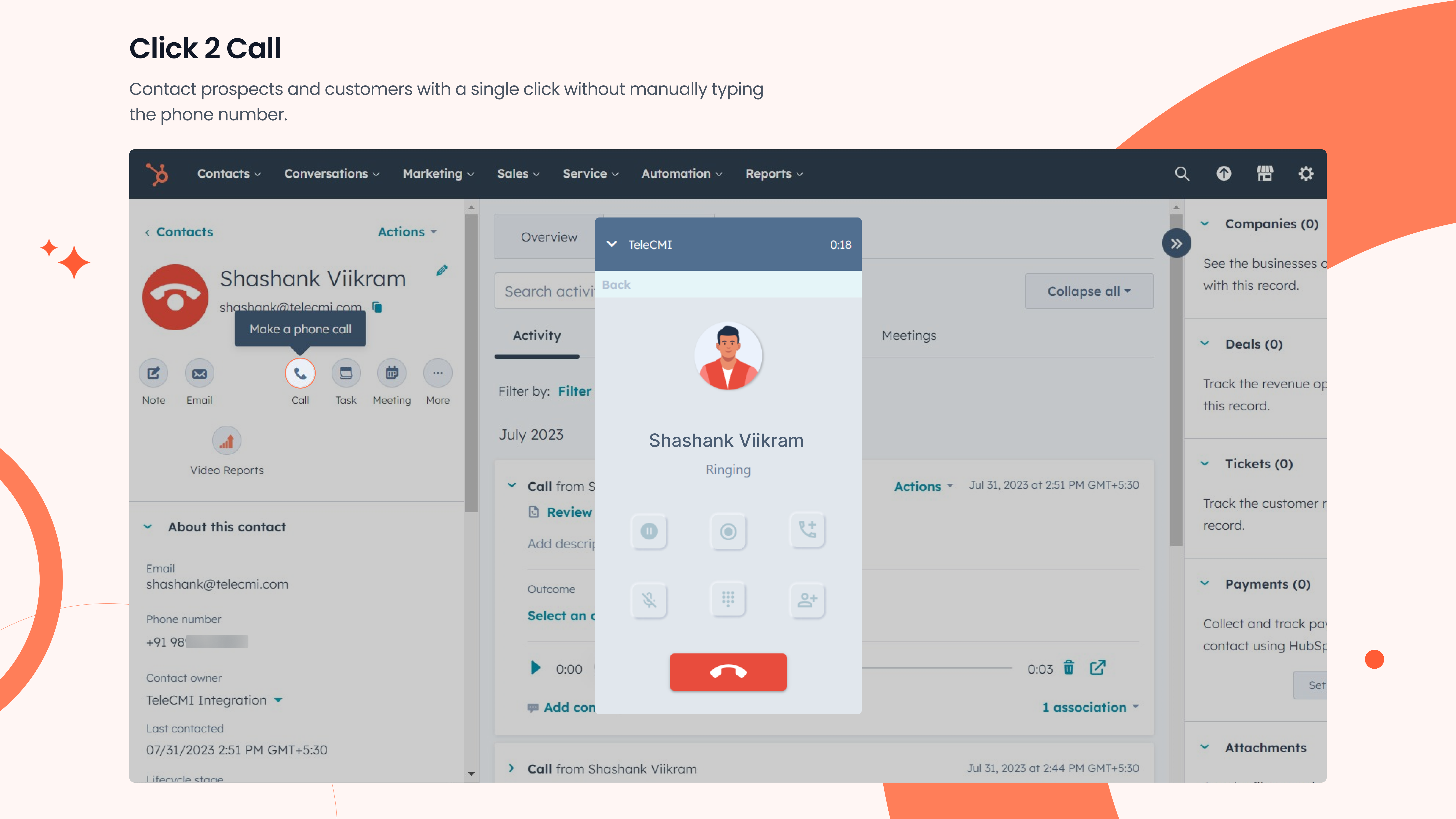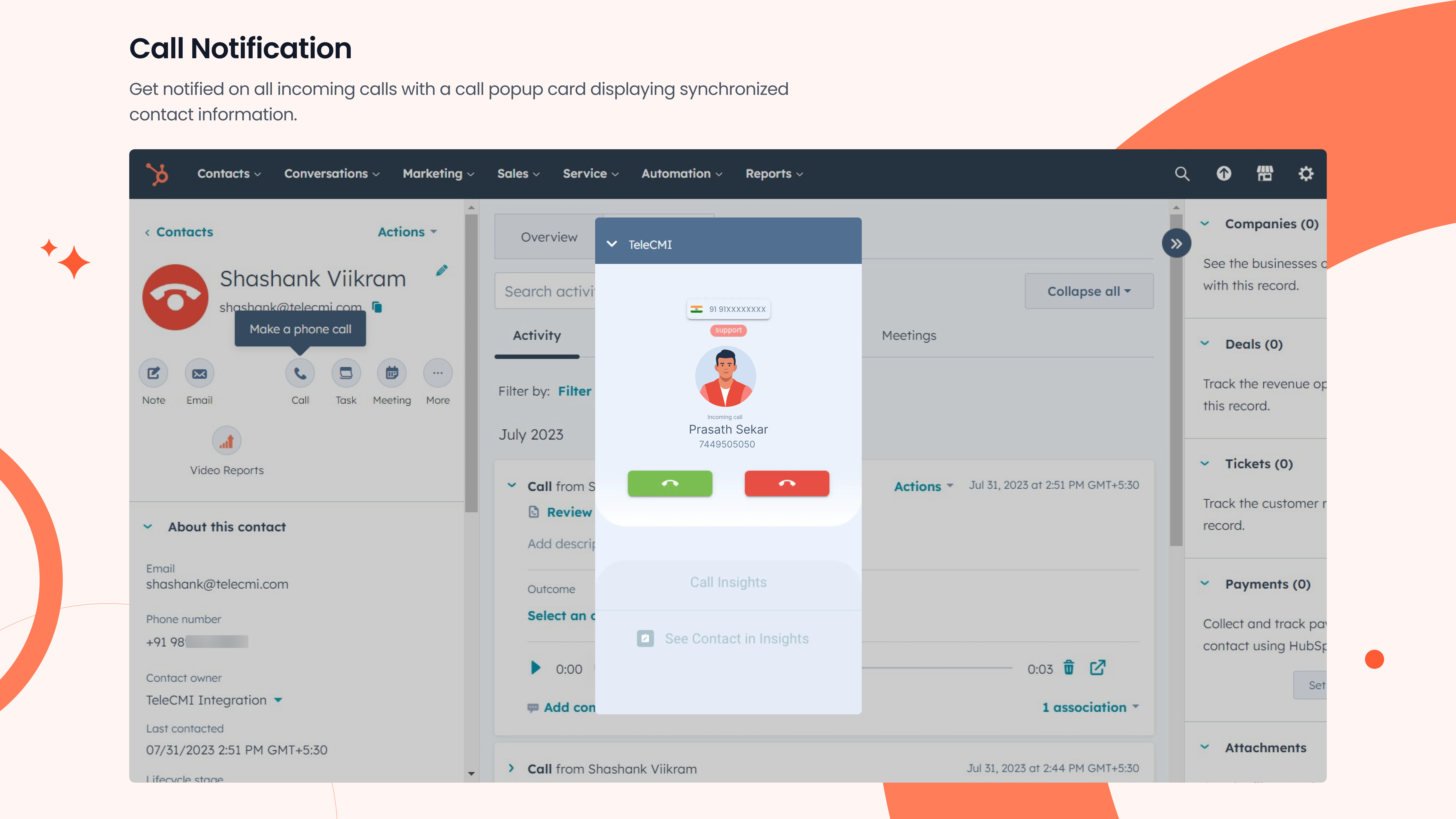 TeleCMI integration with HubSpot unlocks new possibilities for the platform users. Through this integration, you can handle sales and support calls, take call notes, map users, and sync contacts seamlessly from the app.