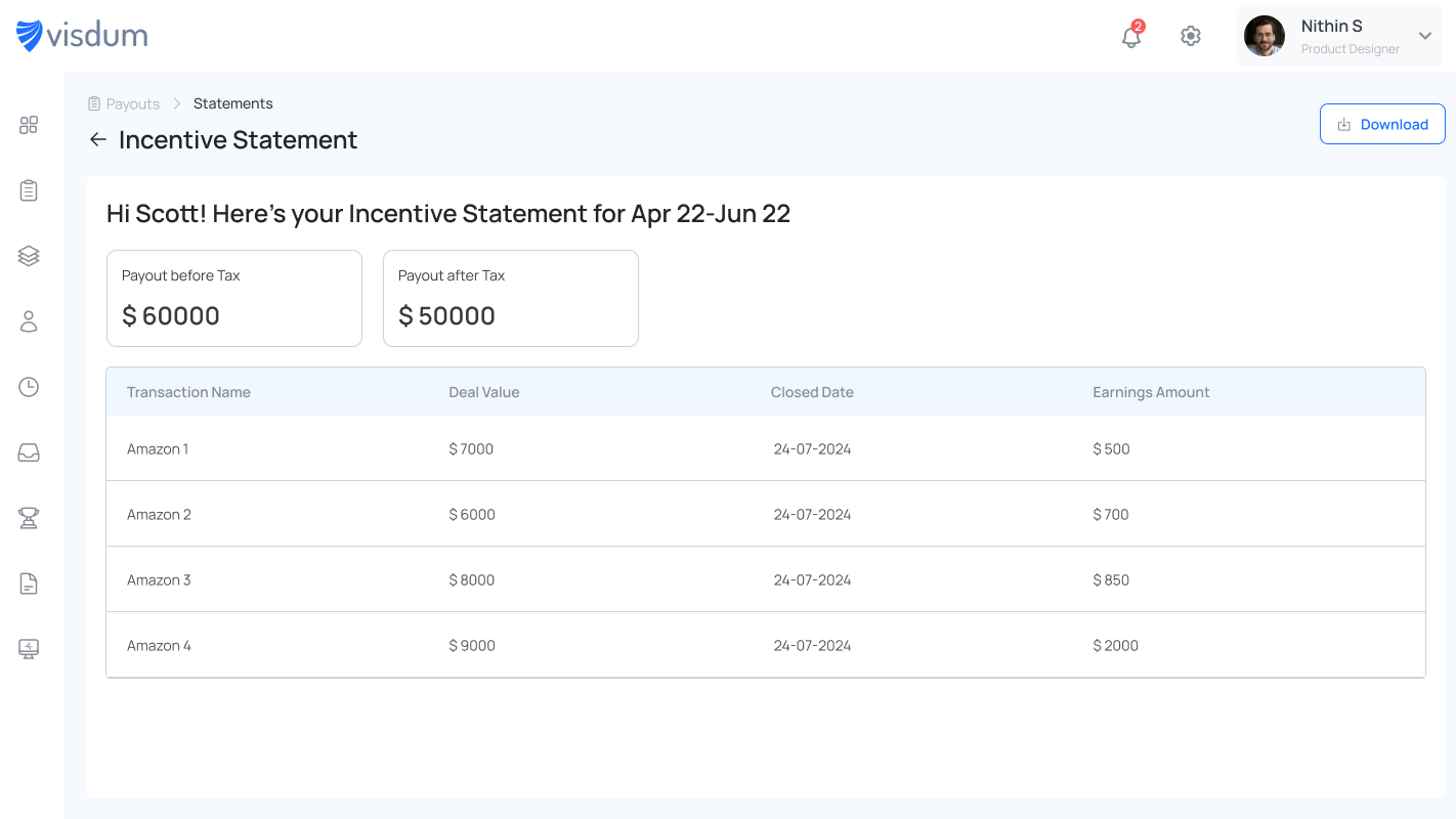 With the HubSpot integration, deals and pipeline will auto-import, and deal-by-deal incentive earnings will be calculated in real-time in Visdum with a detailed view of current & historical payout statements.