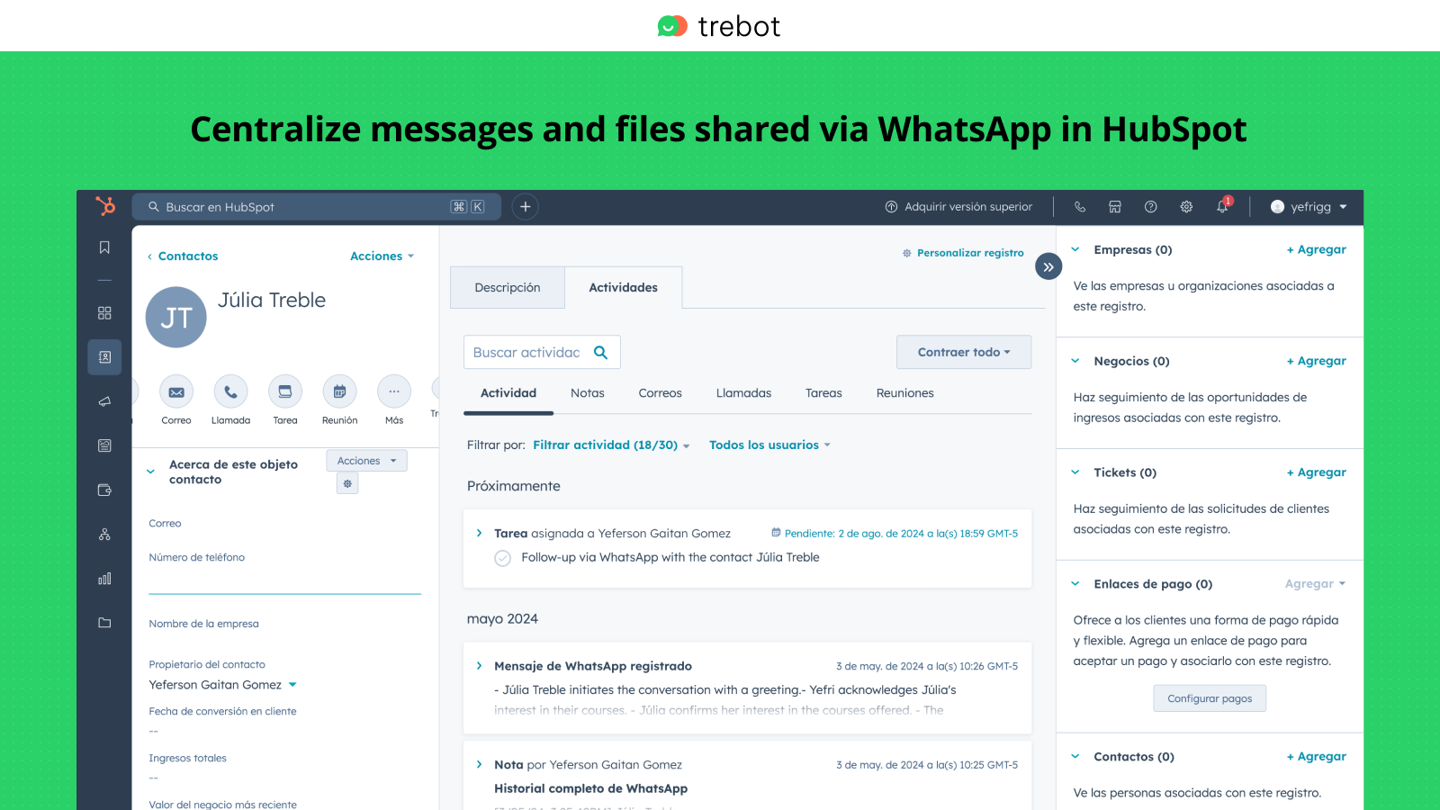 When you receive a message from a new customer, simply add their details from WhatsApp and Trebot will help you update this information in HubSpot.