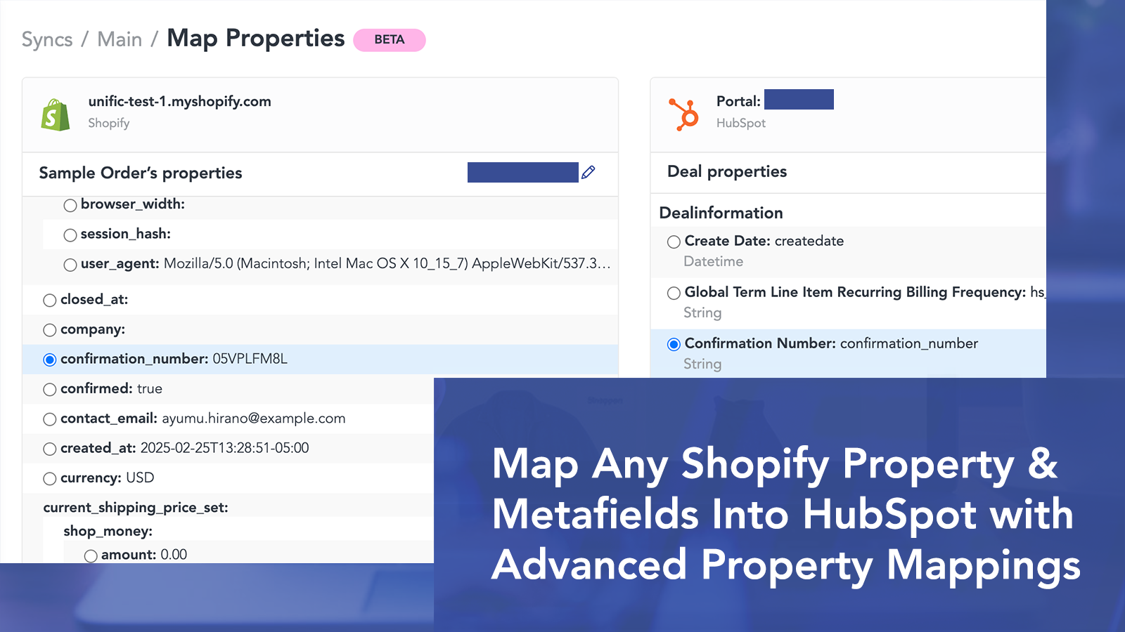 Map any properties, including metafields, from Shopify objects (Orders, Customers, Products and Companies) to the equivalent HubSpot Objects.