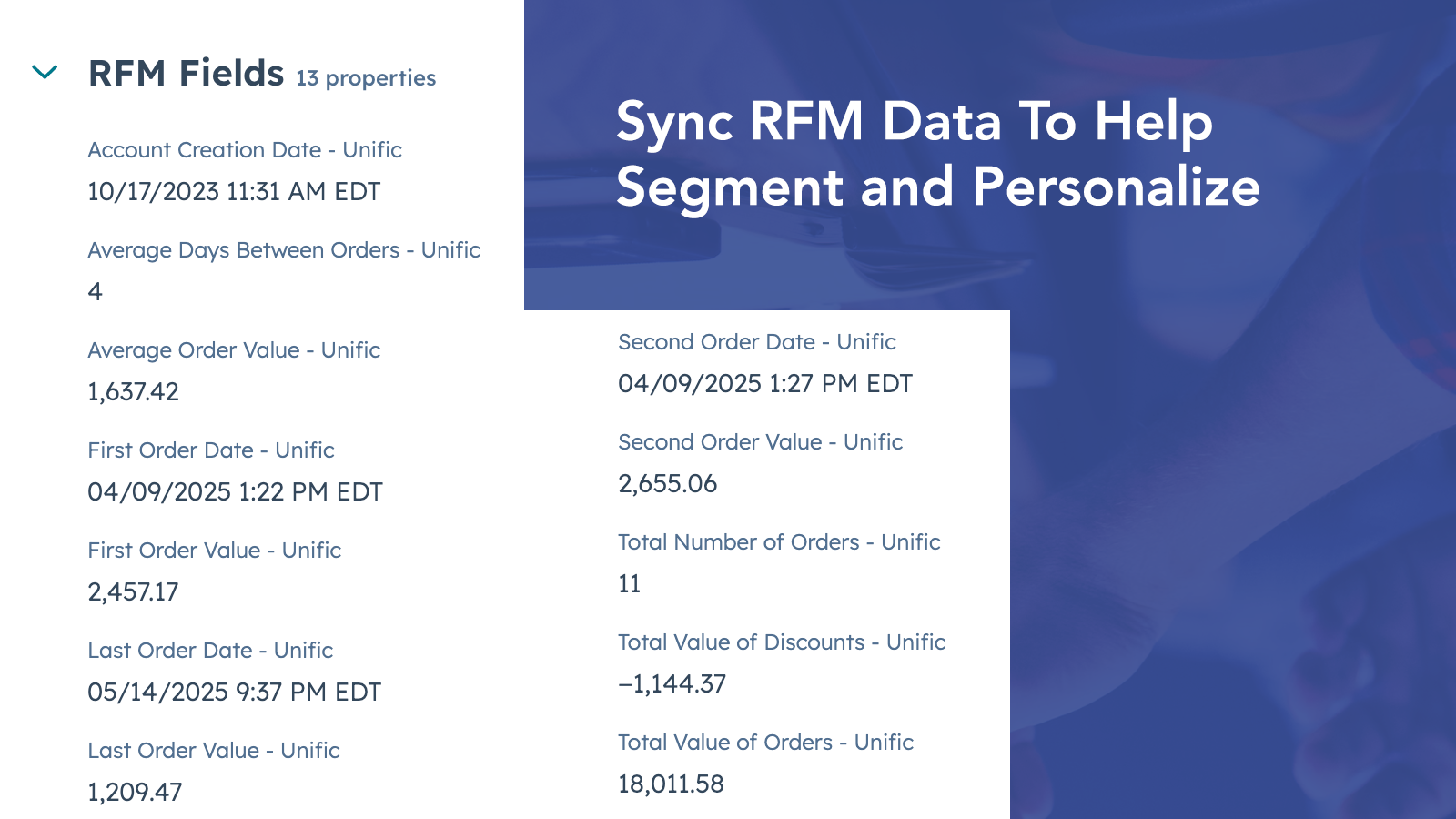 Unific will enrich the data we are syncing with Recency, Frequency, Monetary data (RFM data) so that you can understand your customers and create more specific segmentation based on how much each customer spent, when the last time they bought, and the average days between orders.