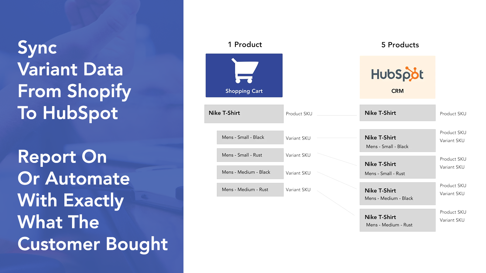 Unific is the only Shopify integration that syncs Shopify Variants into HubSpot. Each variant is created as a separate product in HubSpot and maps the Product SKU and the Variant SKU.