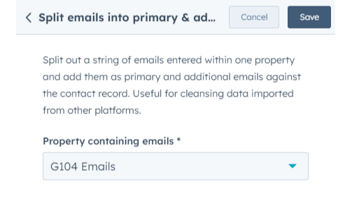 Split out a string of emails entered within one property and add them as primary and additional emails against the contact record. Useful for cleansing data imported from other platforms.