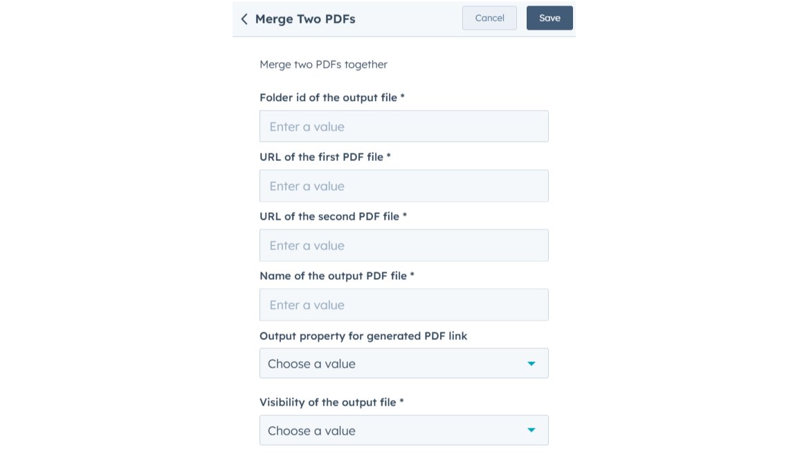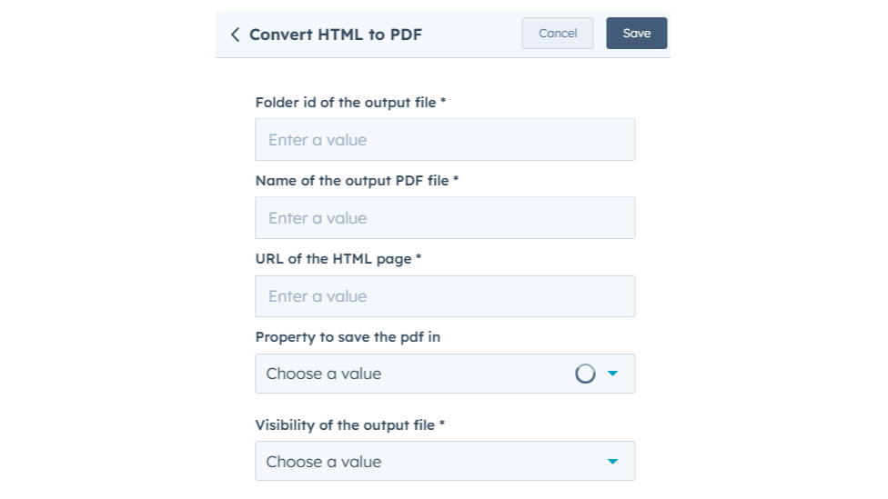 Allows you to generate PDF files from HTML content directly within workflows. This action is useful for automating the creation of PDF documents, such as invoices, contracts, or reports, using dynamic data from HubSpot records.