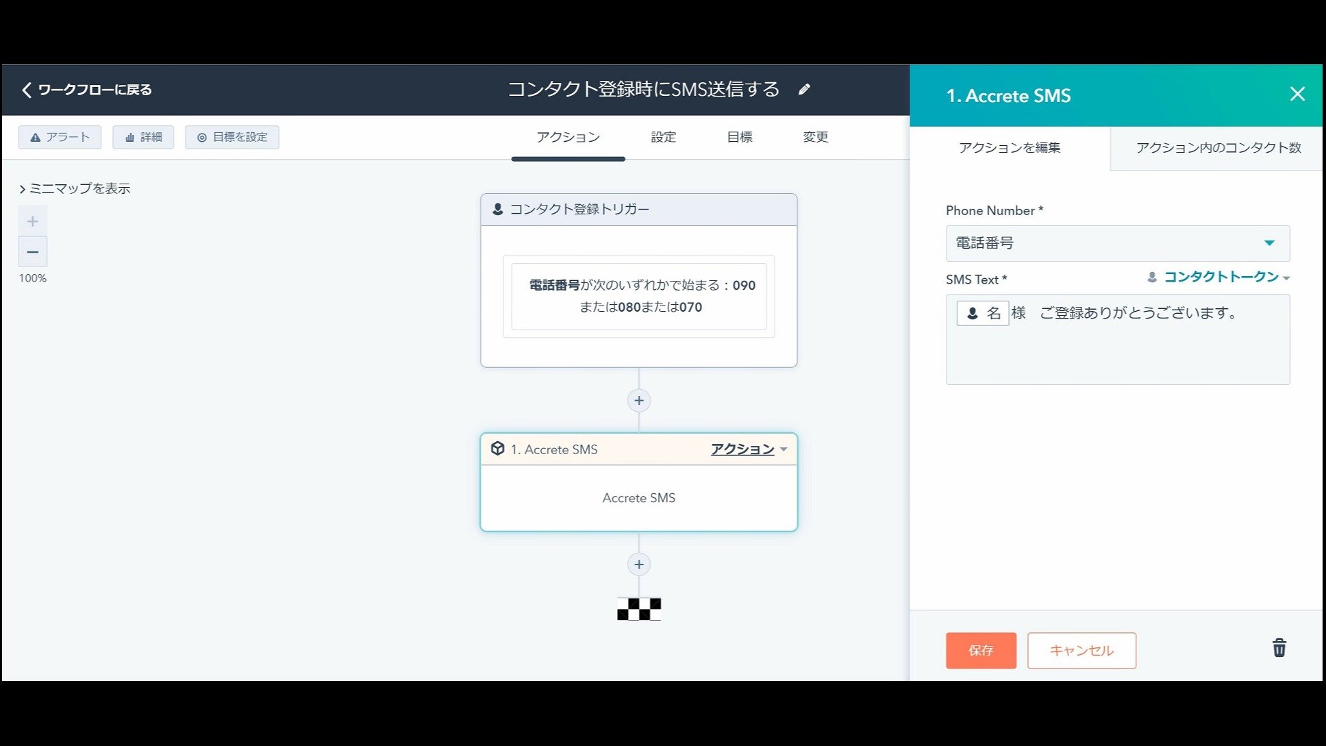 ワークフローのアクションとしてSMS送信を組み込むことができます。例えば、コンタクト登録時に挨拶メッセージをSMSで送信することが可能となります。