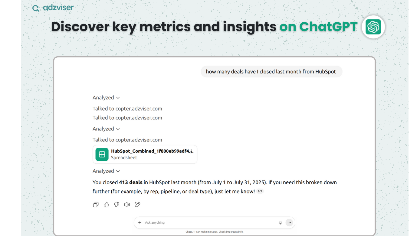 Seamlessly connect your CRM and marketing data from HubSpot to AI tools like ChatGPT. No more downloading or uploading files—your data is just one prompt away.