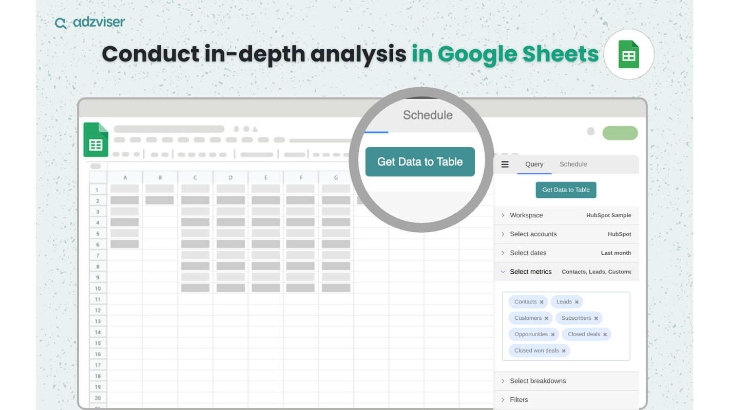 No more jumping between platforms to download reports—automated, cross-channel marketing reports are now just a few clicks away. With the Adzviser Google Sheets Add-on, you can easily schedule daily, weekly, or monthly reports from HubSpot and more, customized with the metrics and breakdowns you care about.