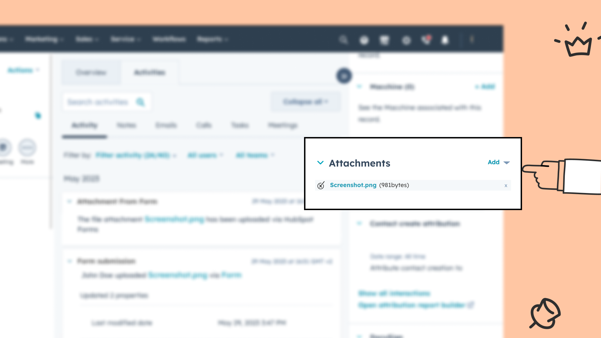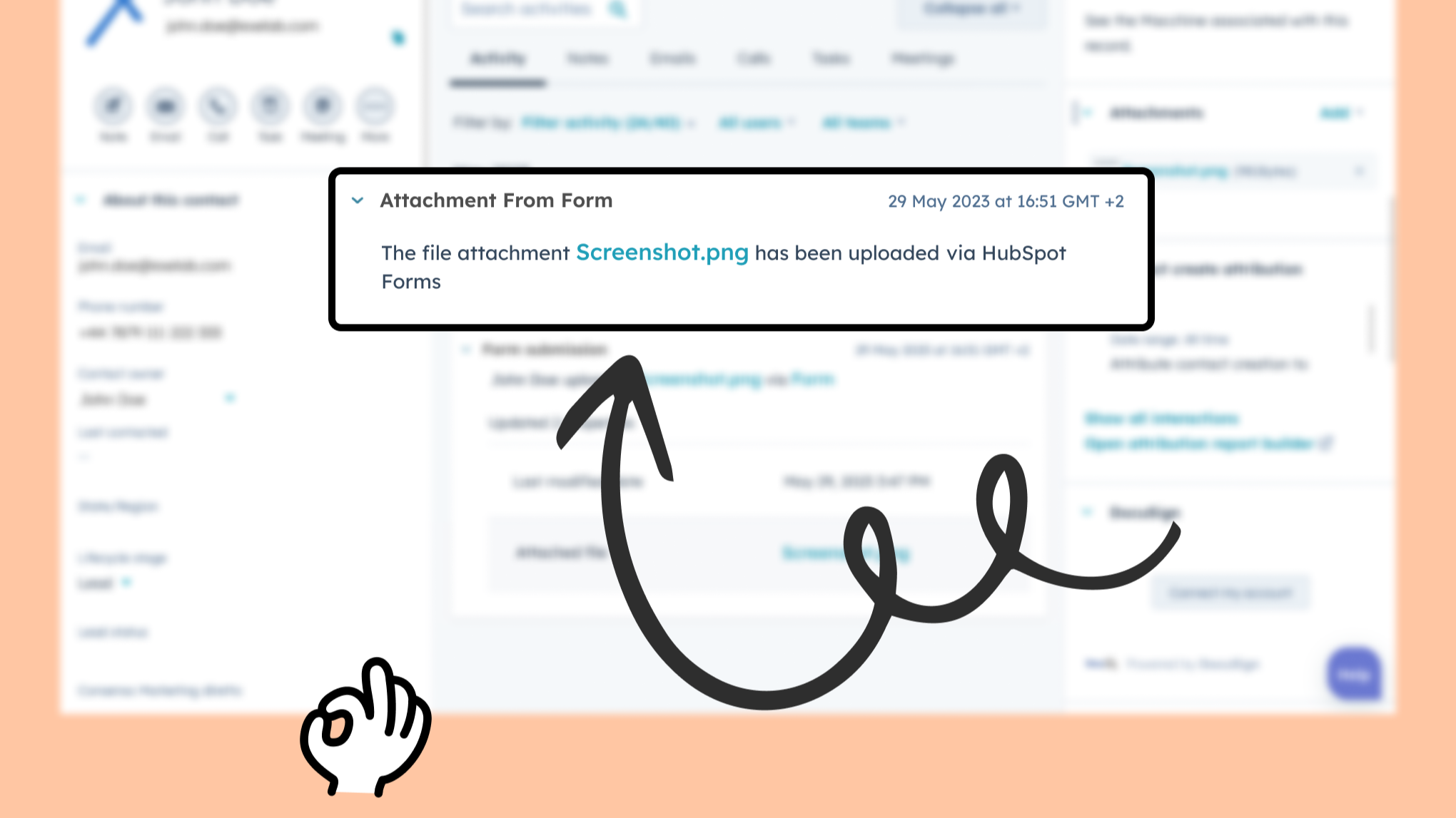 When a contact fills out a file type property in your form, the file will directly appear in the HubSpot Attachment CRM card. This way, you can easily find the associated file on the contact page without wasting time searching the HubSpot database.