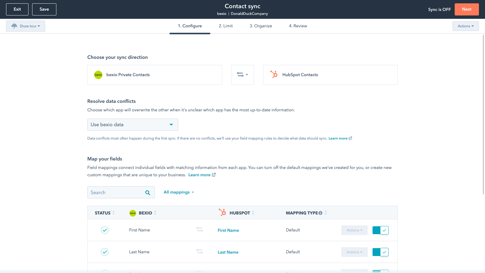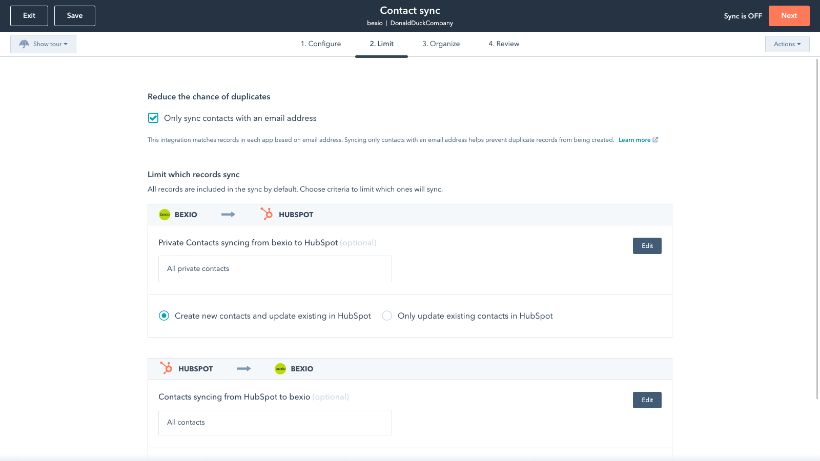 - Two-way sync: Data is shared between Bexio and HubSpot in real time
