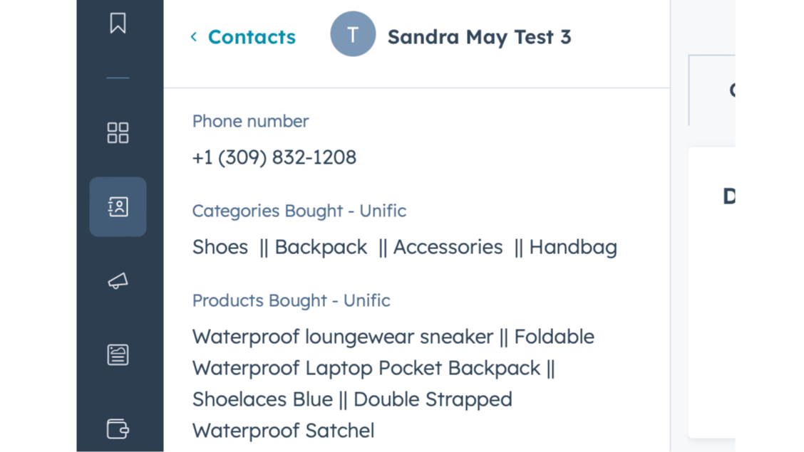 Unific's aggregated properties on the contact save info products/categories bought in the customer lifetimes'. This allows you to create lists and trigger up selling and cross selling campaigns based on real life customer behavior without having to navigate and learn about HubSpot's complex objects hierarchy, leading you to more ROI.