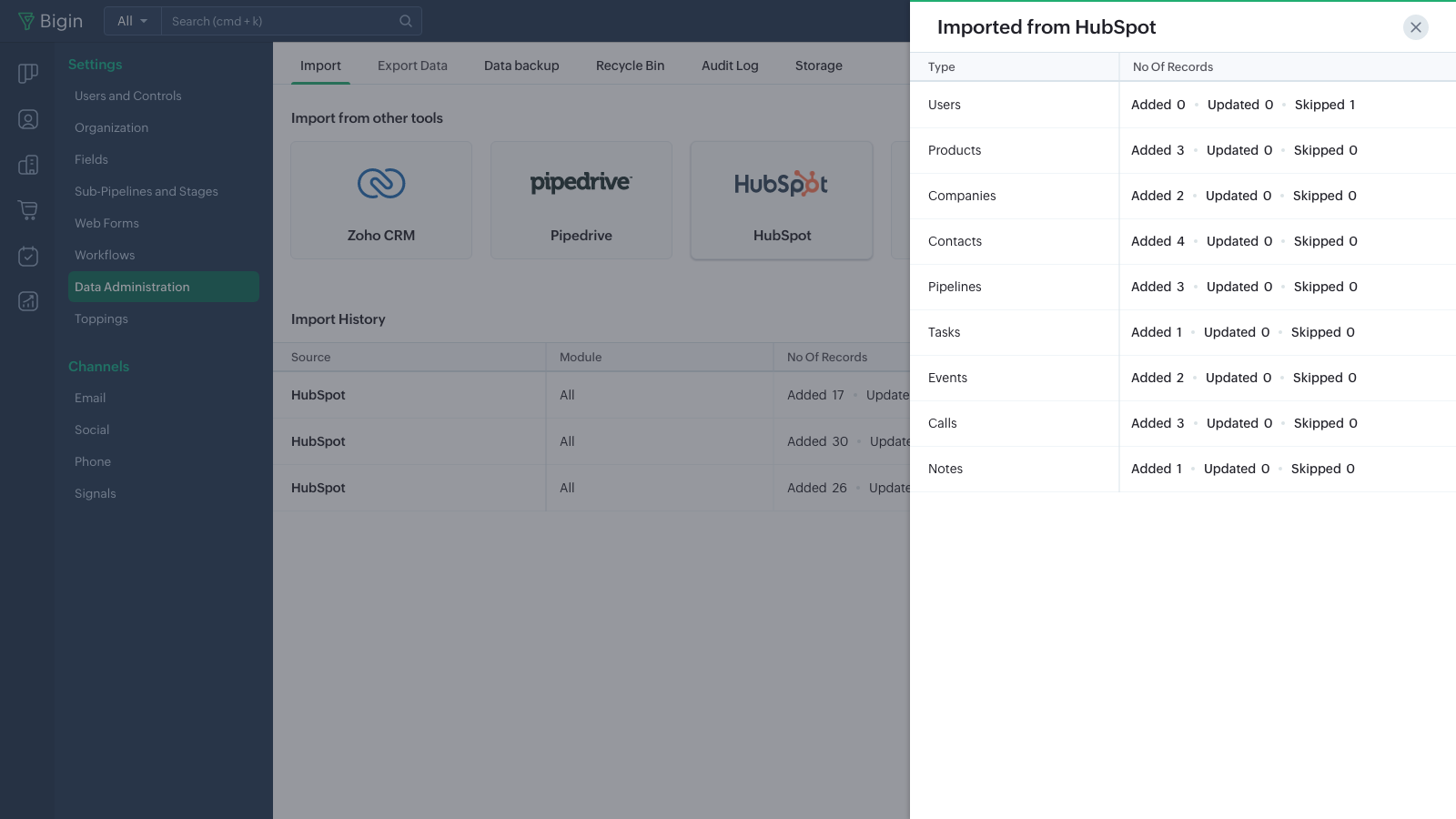 All of your companies, contacts, deals, notes, tasks, calls and meetings from your HubSpot account are automatically transferred to your Bigin account. You can view a detailed summary of how many records have been successfully imported or skipped from the Import History.