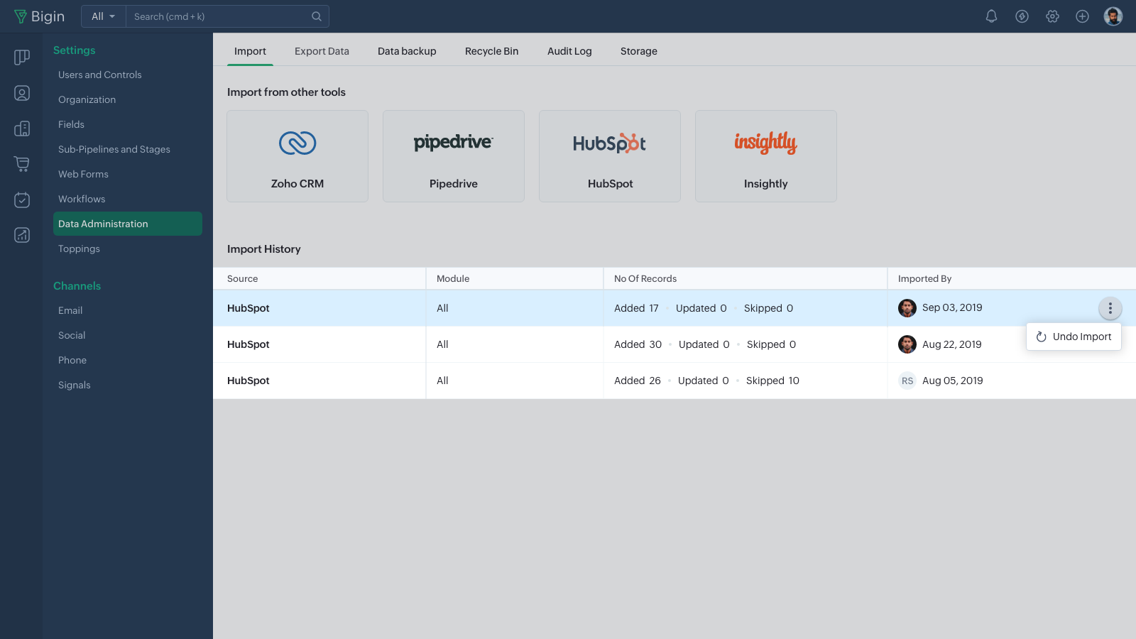This lets you import data from your HubSpot account automatically into Bigin in a single-click. This saves you from the hassle of manually exporting data from your HubSpot account and importing them into each of the Bigin modules separately.