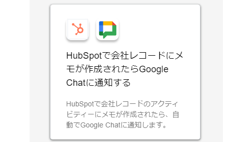 よくある業務フローをテンプレート化してある「レシピ」を選ぶだけで、HubSpotで会社レコードのメモが作成されたことを検知し、メモの情報をGoogle Chatに通知する業務フローが簡単に作成可能です。