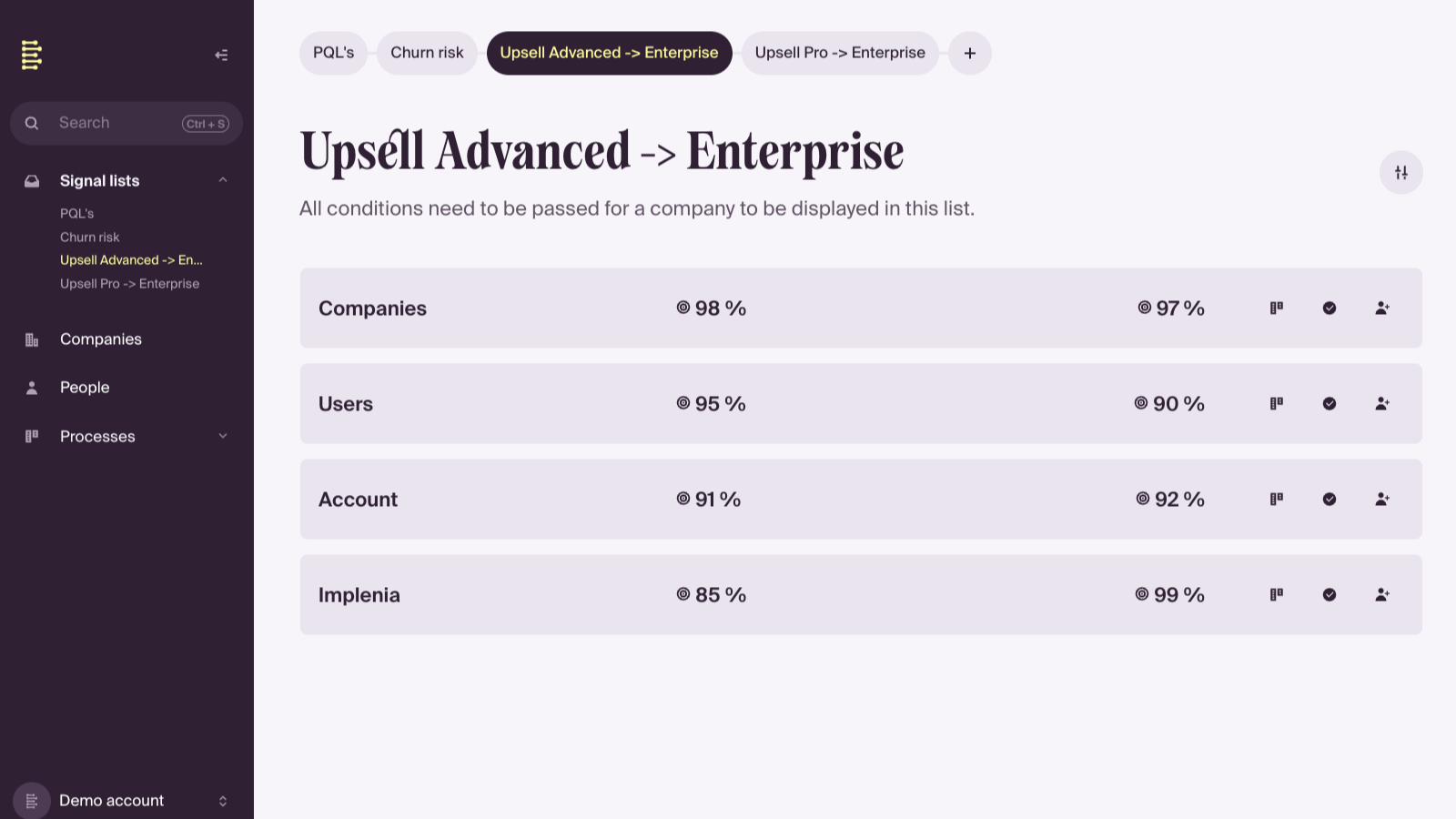 Segment, filter, and sort your users or accounts based on product usage, customer fit and other scores. Surface the highest value opportunities prioritized for you in a customizable view.