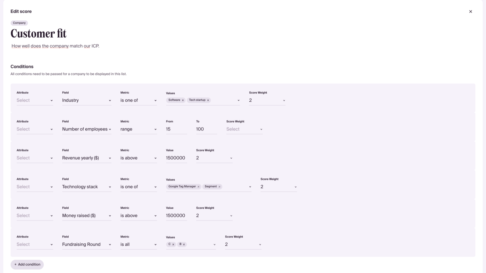 Define your own custom scoring logic to qualify and prioritize leads and accounts to know who your reps and CSM’s should spend their time with. You can set up as many scores as you want, MQL, PQL, customer health, customer fit and more to have scores for the entire customer lifecycle. Then easily send the scores back to HubSpot.