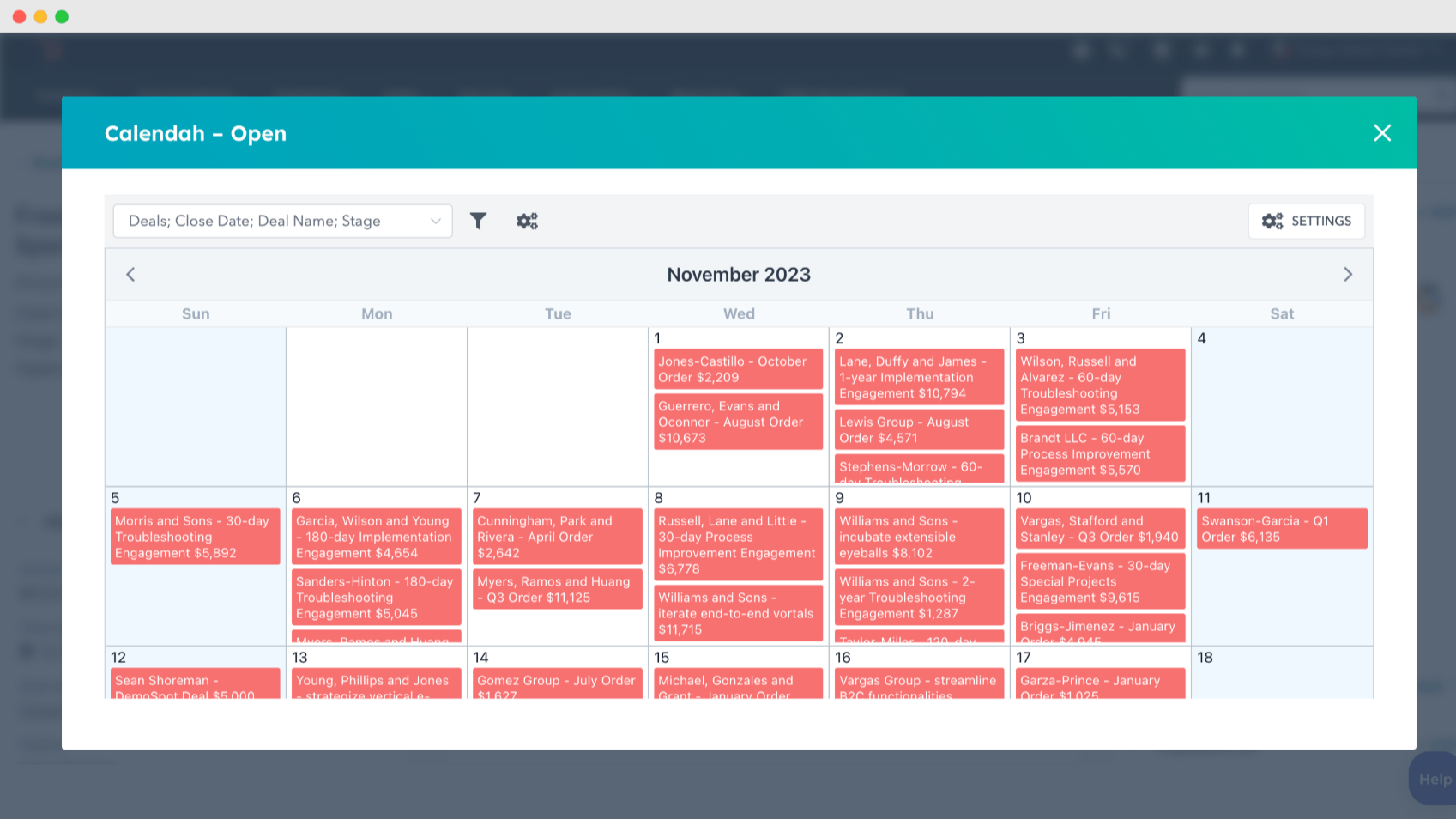 Calendah transforms HubSpot records into a visual, monthly calendar view, making it easier for users to see and understand their data at a glance. This visual representation helps users quickly identify important dates and timelines, enhancing their ability to manage and prioritize tasks effectively.