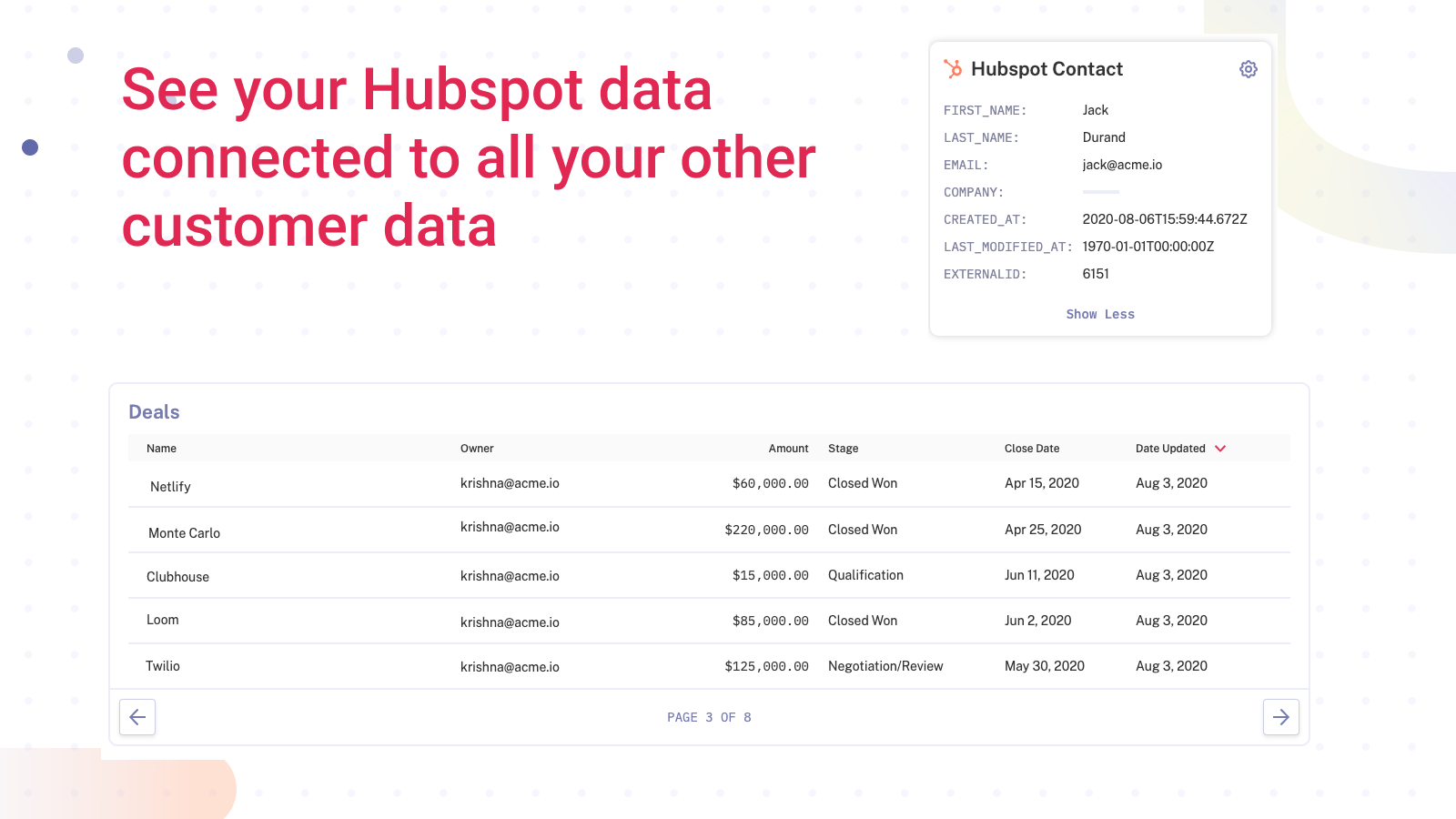 Now you have one place to get complete customer context. Calixa connects your HubSpot data with data from the other apps you use. See your HubSpot data connected to data from Stripe, Zendesk, Intercom, Segment, etc. Even better, no engineering is required! Calixa takes care of it all.