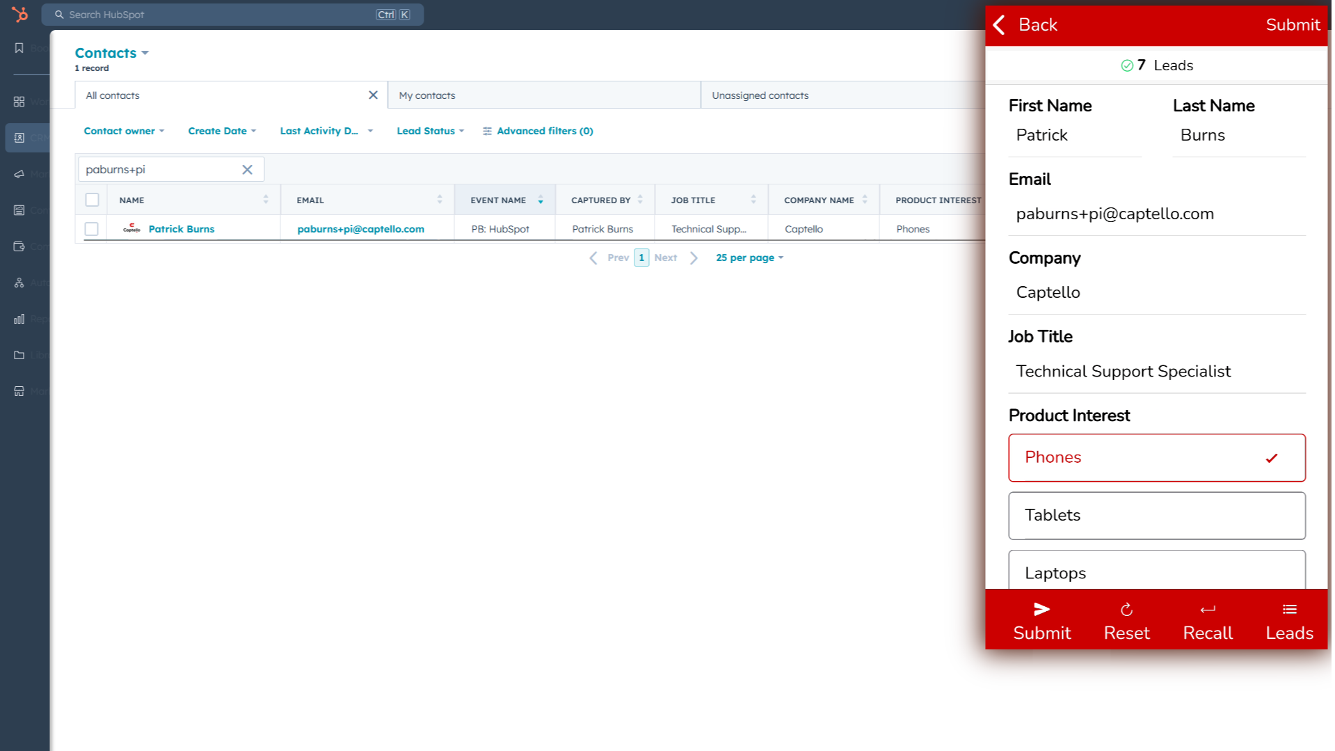 Syncing a lead to HubSpot is as simple as tapping the 'Submit' button!