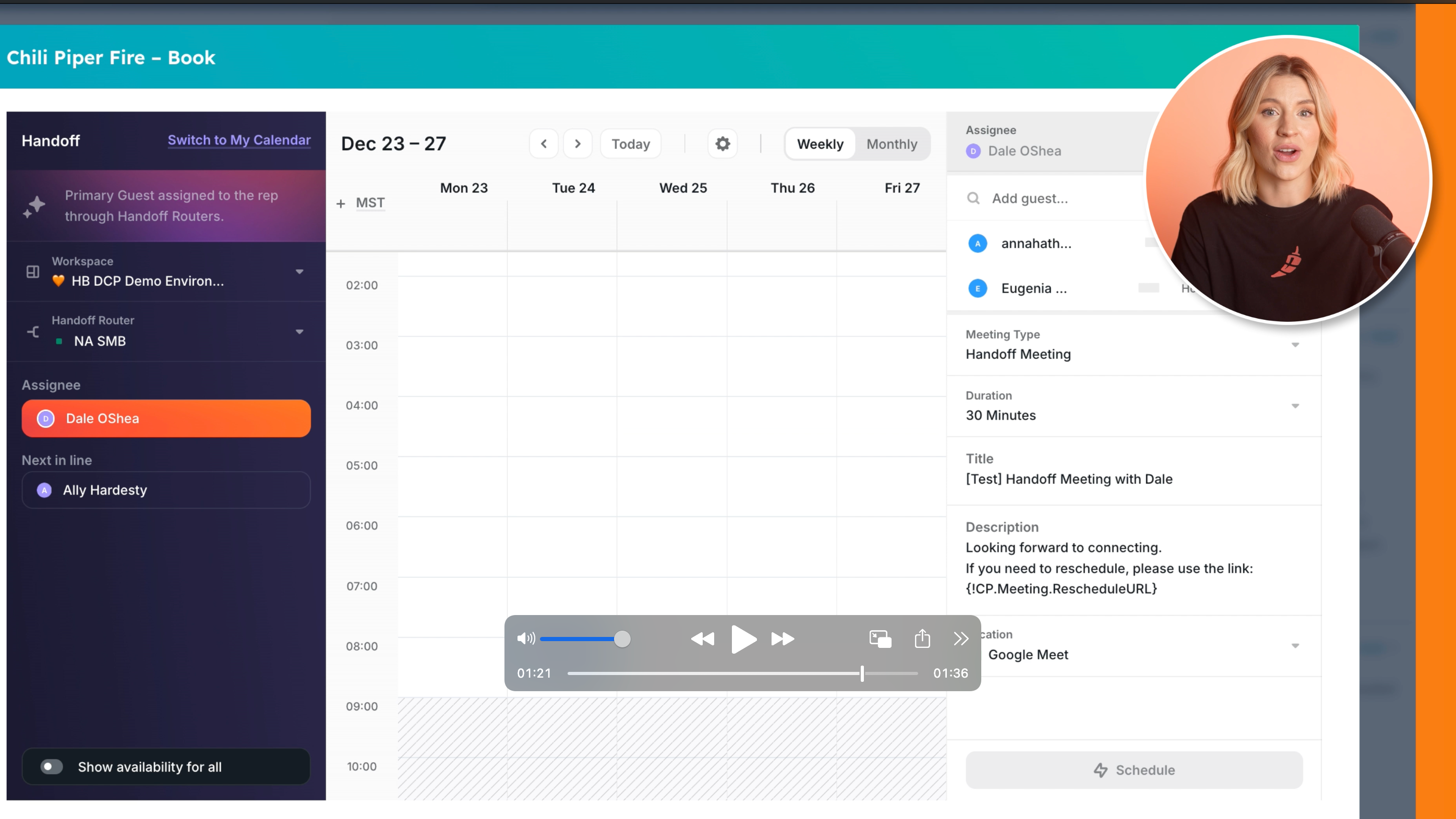 Route based on your specific routing rules (e.g. industry, company size, region). Route to account owner. Handoff meetings to other reps Live (via phone call or instant Zoom meeting). Re-use routing rules and teams across other Chili Piper products.