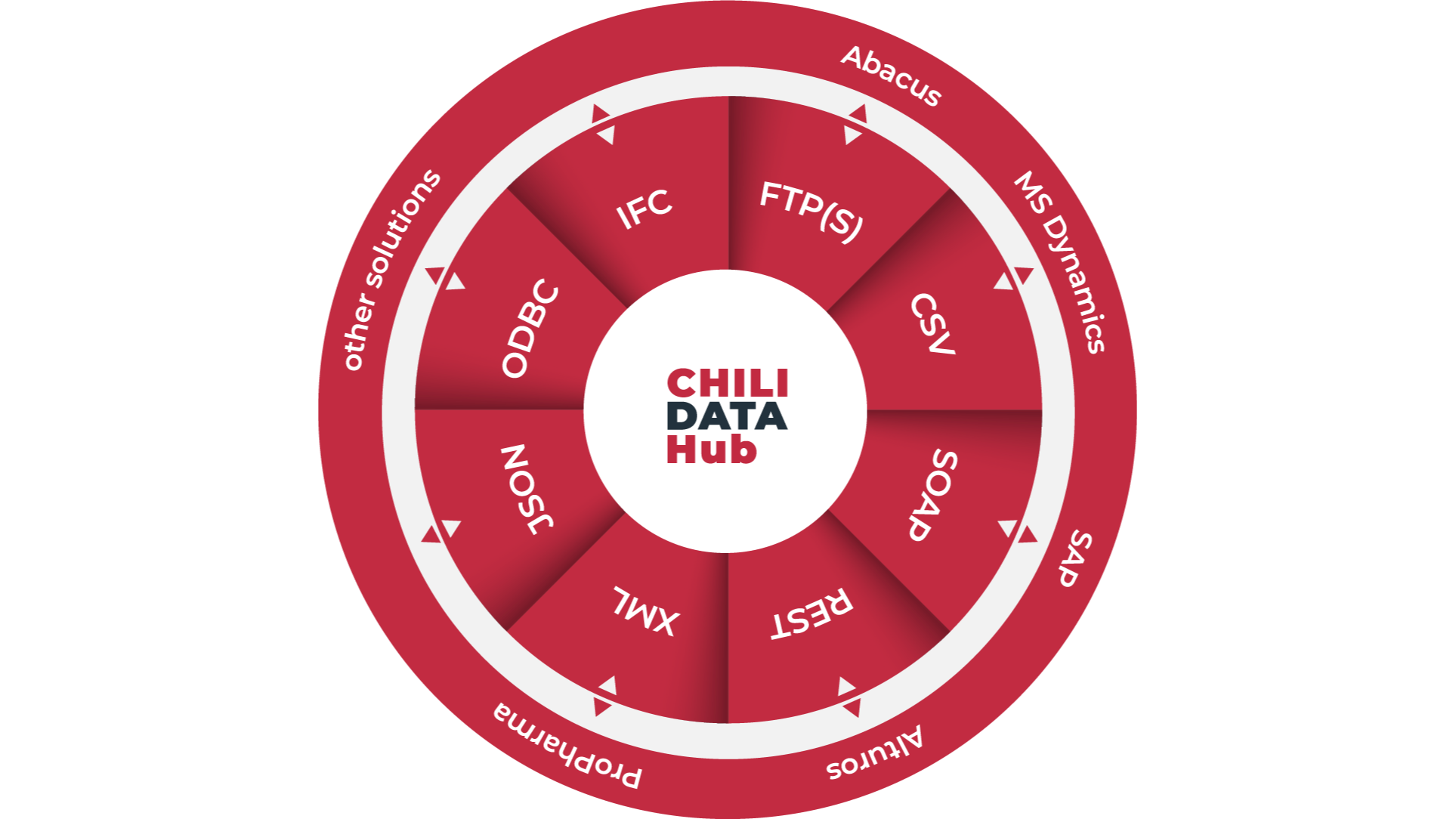The ChiliDataHub® can connect any external system via all common technologies like REST , SOAP, XML, FTP and many more.