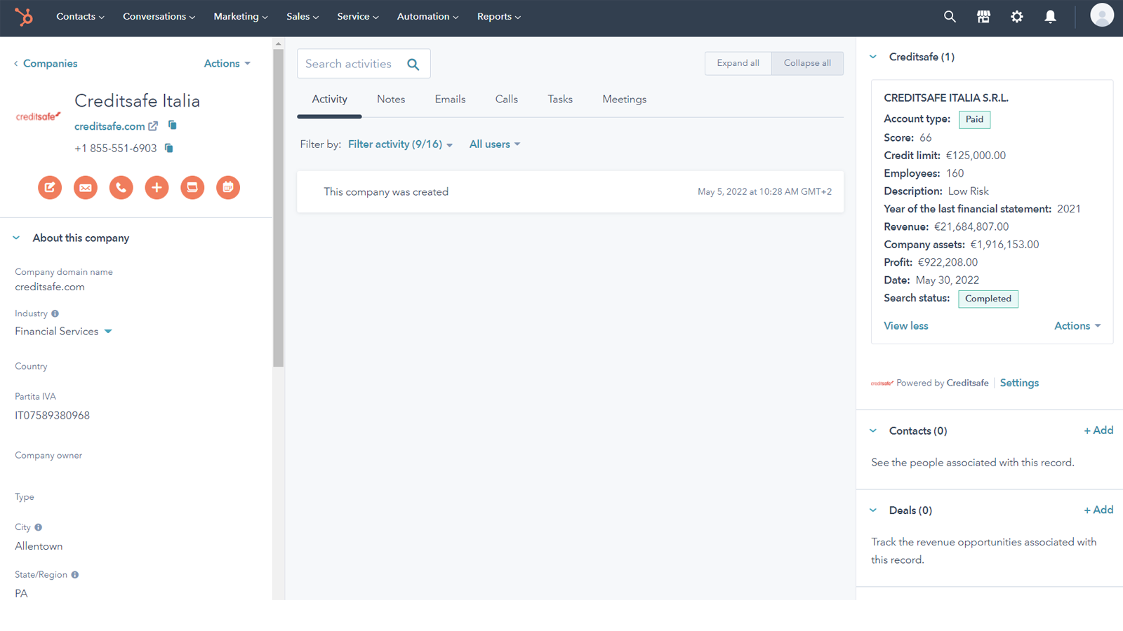 1/3 - Screen of HubSpot, showing on the right the CreditSafe card