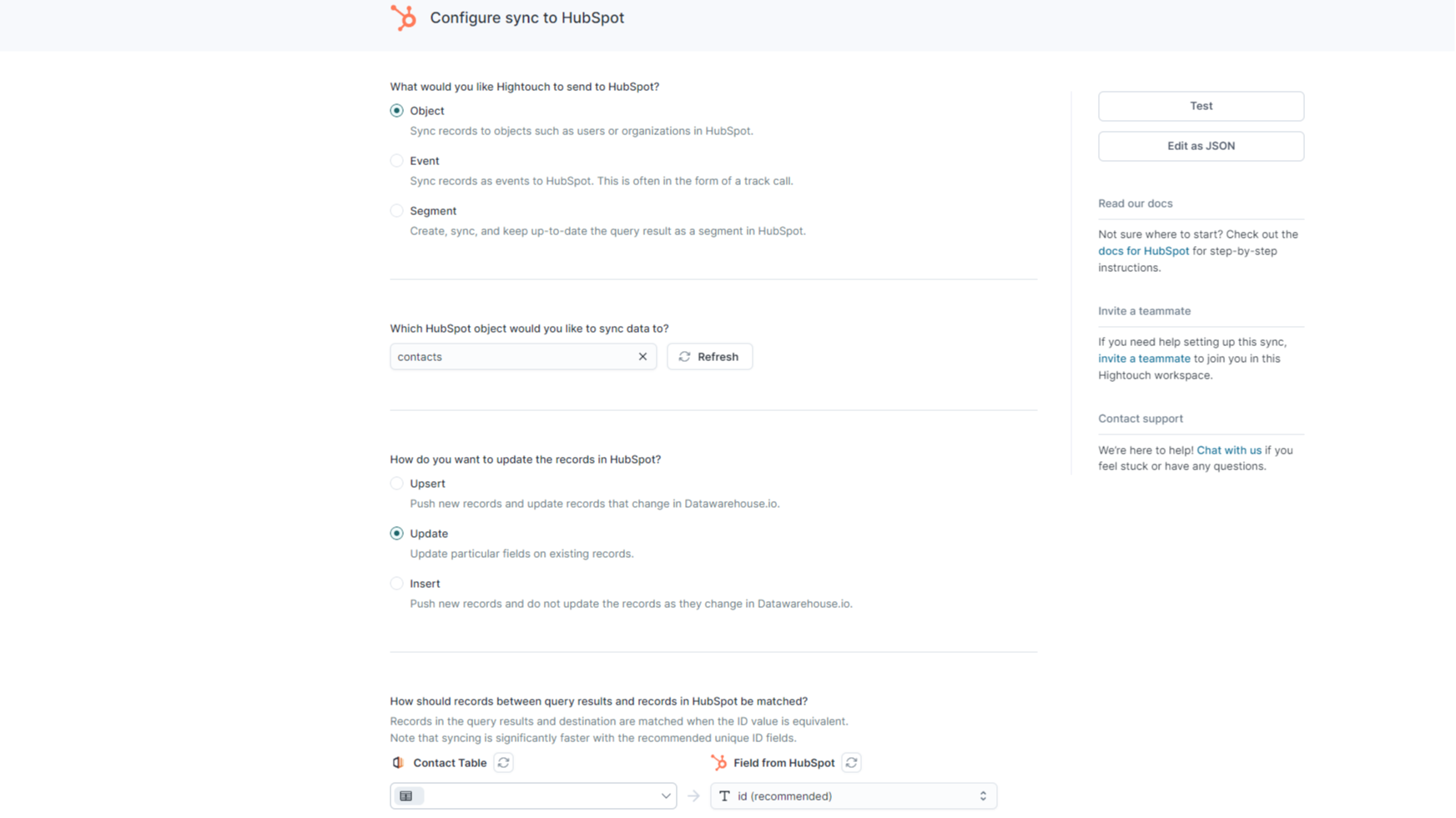The setup process for integrating HubSpot and Hightouch using Datawarehouse.io for Hightouch is quick and easy. With just a few steps you can be up and running in a matter of minutes ready to start building your integrations.