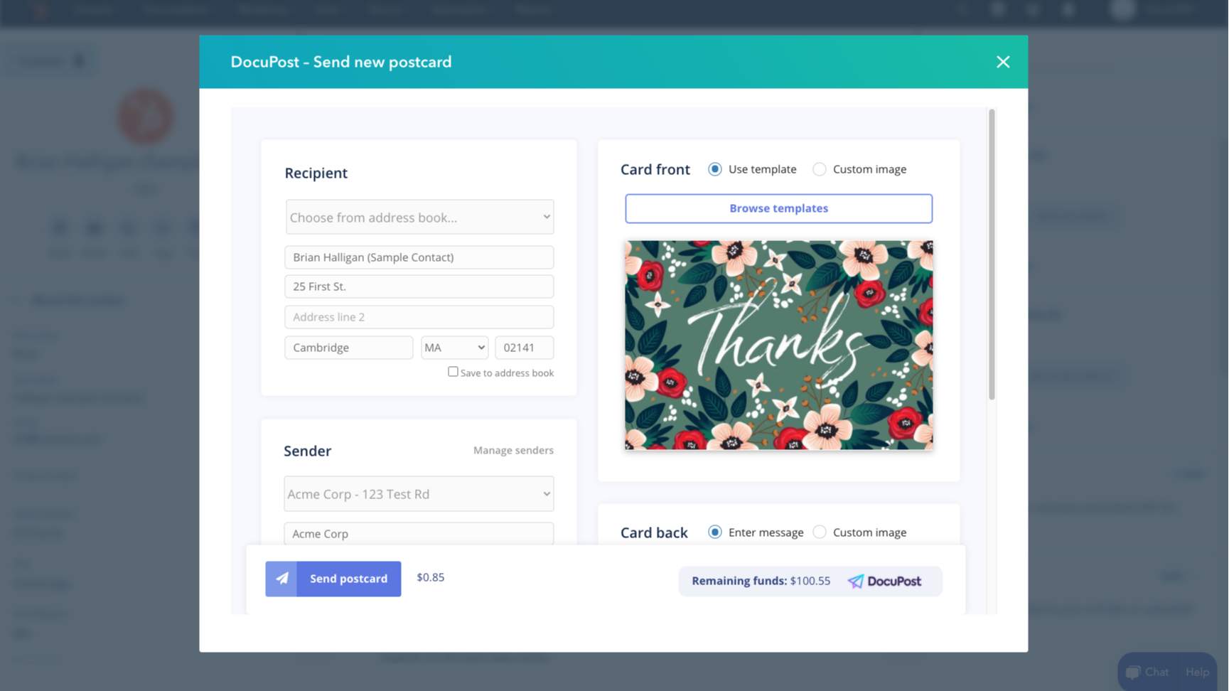 No more finding stamps or running to the post office. You can connect DocuPost and HubSpot to easily send letters, checks and postcards to any contact or company record.