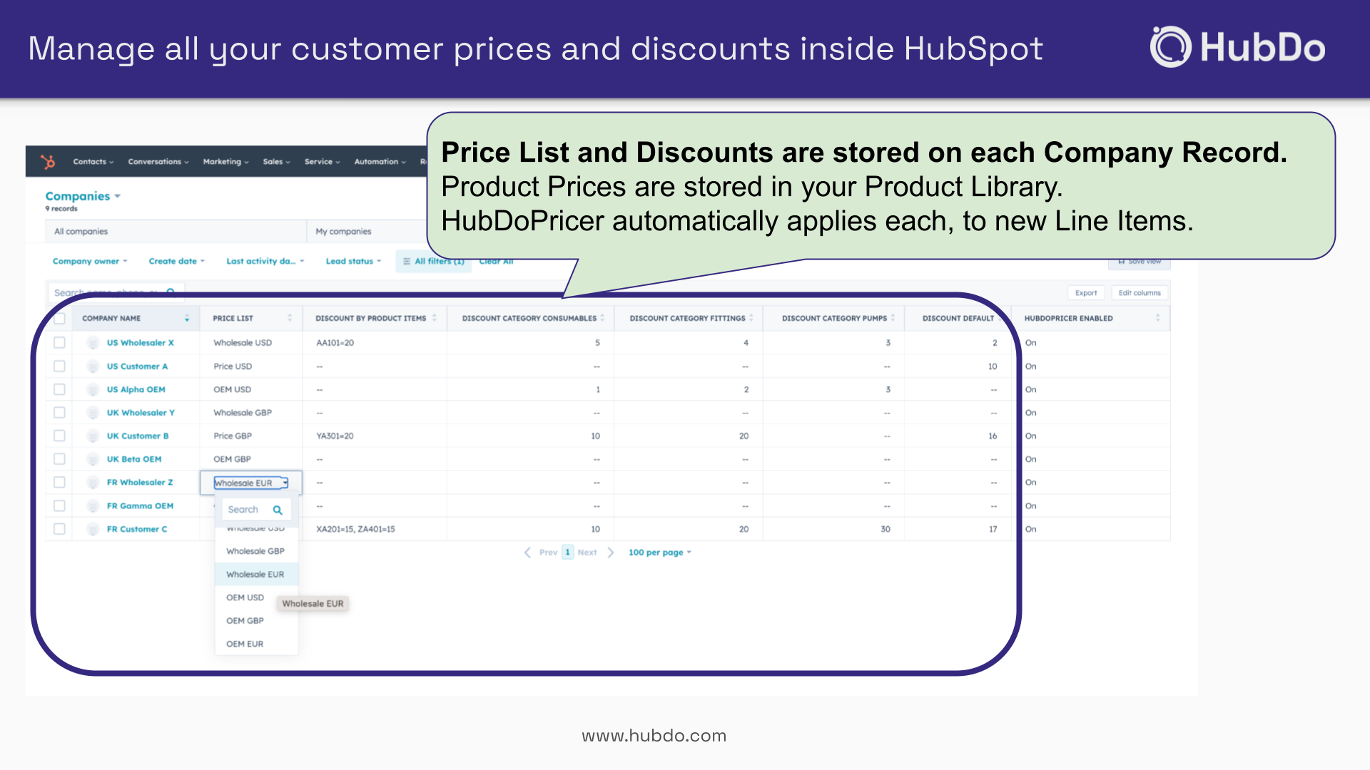 Set discounts and/or a custom price list on HubSpot company records