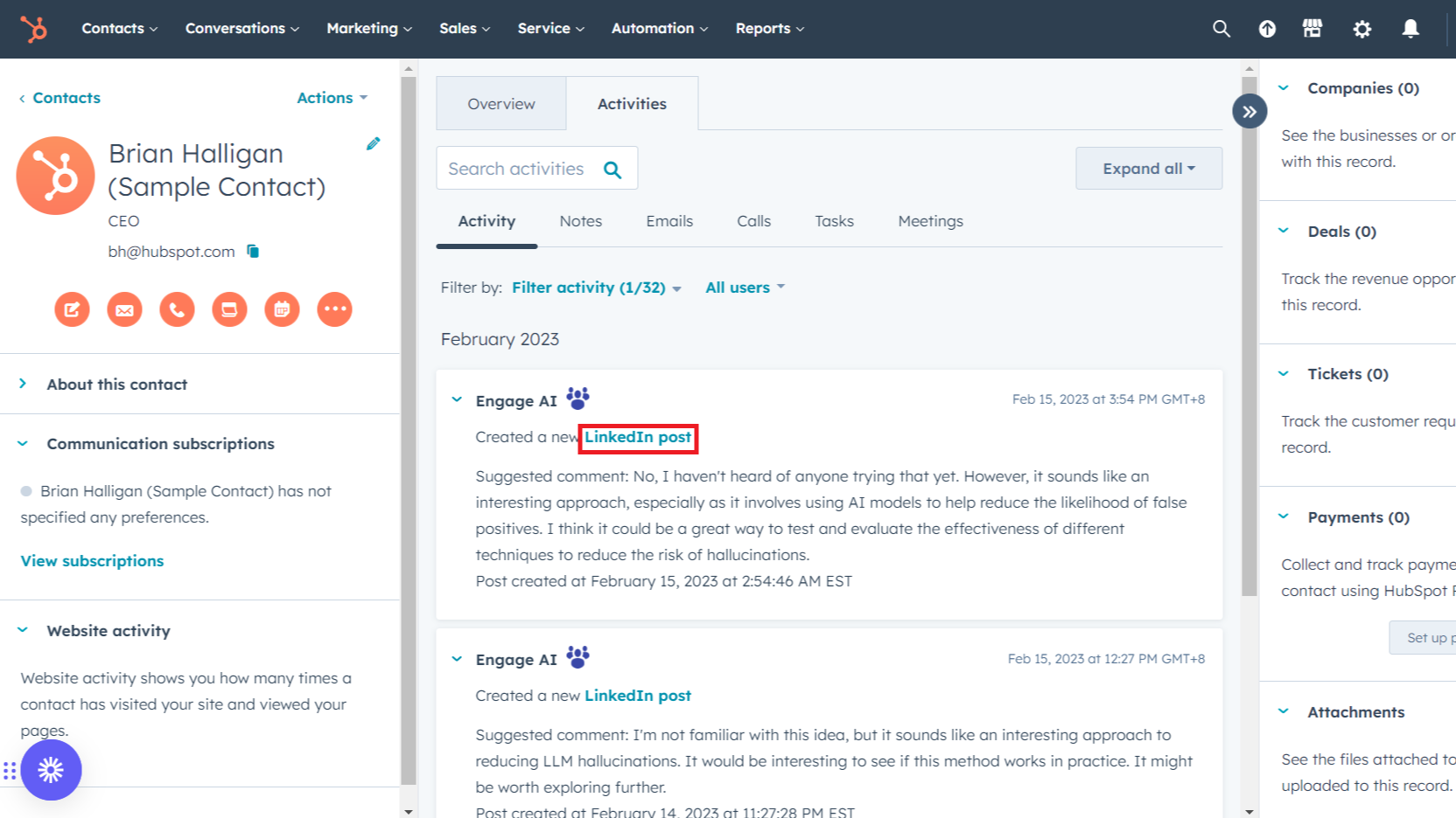 Engage AI has completely transformed how we approach LinkedIn engagement. Integrated seamlessly with HubSpot and LinkedIn, it helps us stay active and relevant in conversations without the time drain of manually crafting comments. This tool is invaluable for target account and online relation nurturing—helping us build relationships, stay top-of-mind, and create meaningful interactions at scale. The AI-generated suggestions are a good basis for editing and making your comments. Making it a perfect fit for anyone serious about LinkedIn networking and interactions. This is a must-have if you're using HubSpot and LinkedIn Sales Navigator. Highly recommended!