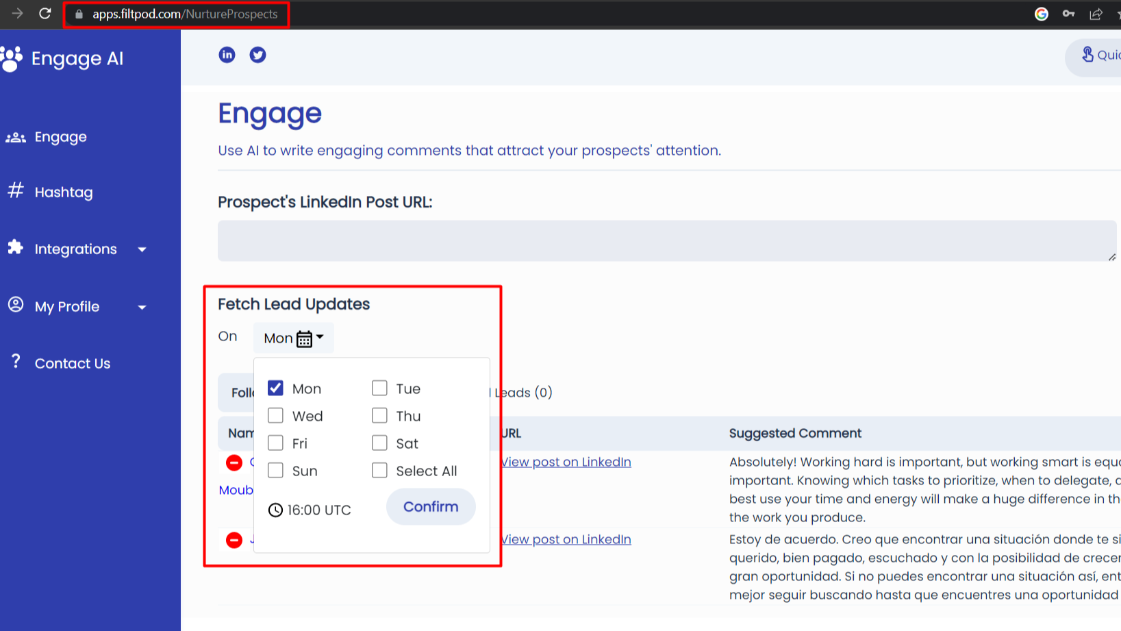 Log into the Engage AI app and select which days you would like Engage AI to fetch your contacts' posts (if any).
