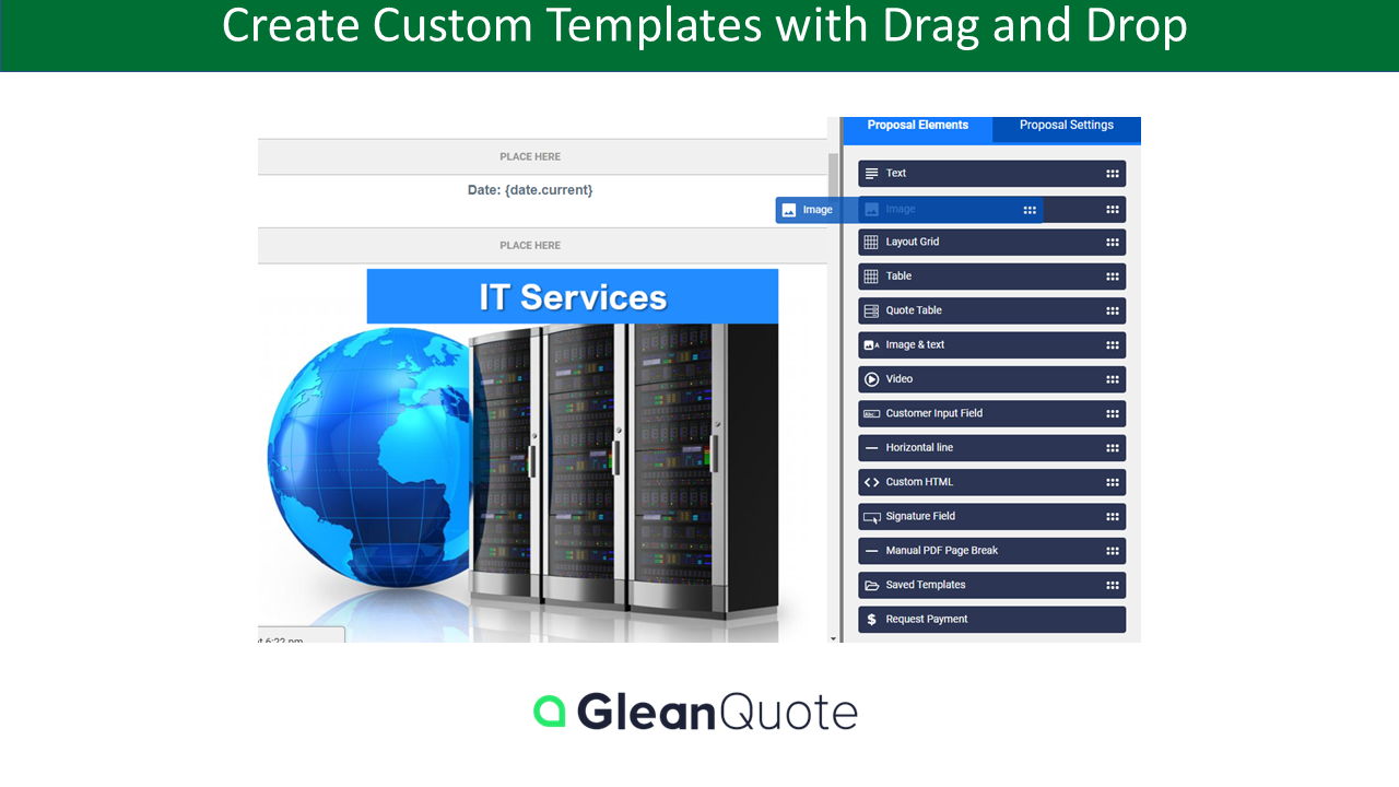 Use GleanQuote's drag and drop template builder to create unlimited custom templates that make it easy for your team to quickly generate quotes and proposals. Use conditional rules to steer your team into the right proposal template and the right products and content for every deal.