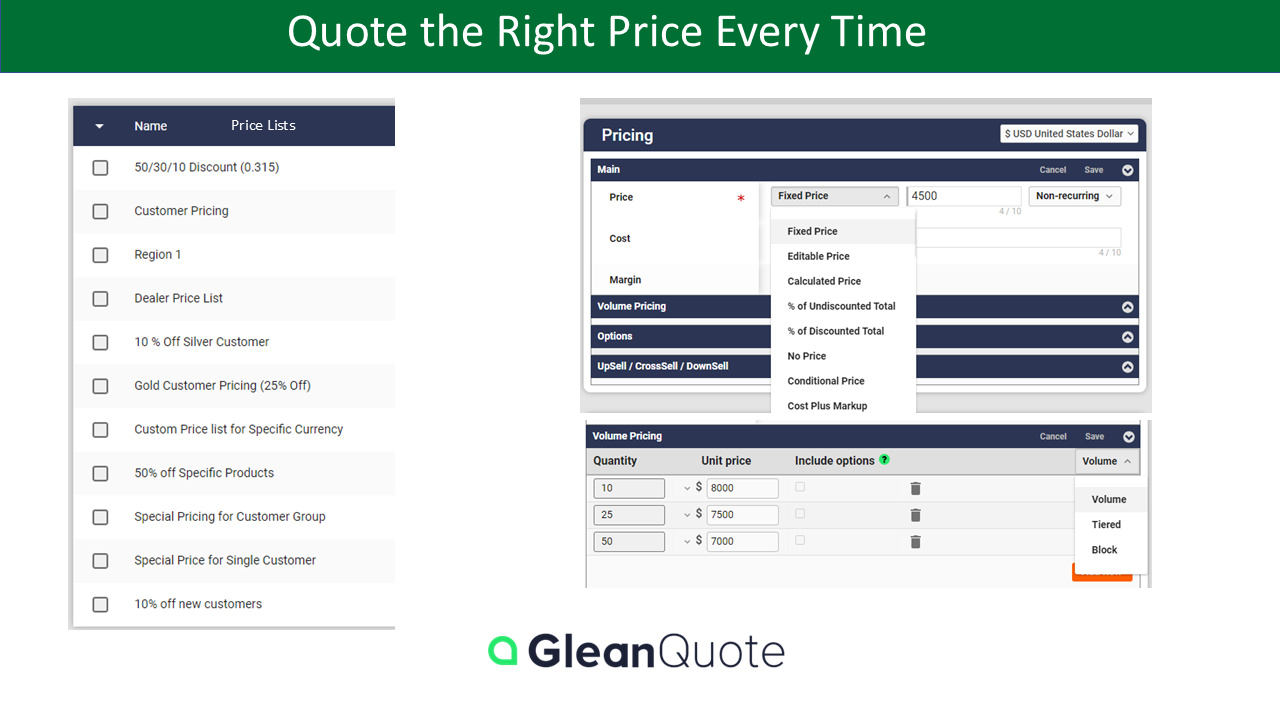 Price your products and services any way you want, from conditional/formula pricing to price books or volume pricing. Use GleanQuote's rule based pricing engine to eliminate the need for complicated, uncontrolled spreadsheets that won't scale as you grow.