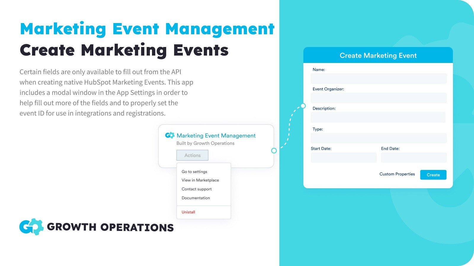 Certain fields are only available to fill out from the API when creating native HubSpot Marketing Events. This app includes a modal window in the App Settings in order to help fill out more of the fields and to properly set the event ID for use in integrations and registrations.