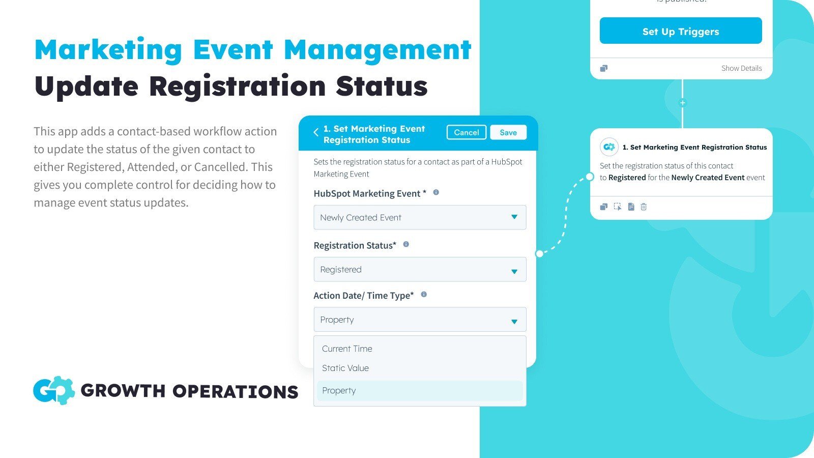 This app adds a contact-based workflow action to update the status of the given contact to either Registered, Attended, or Cancelled. You can also choose when to set the event timestamp. This gives you complete control for deciding how to manage event status updates.