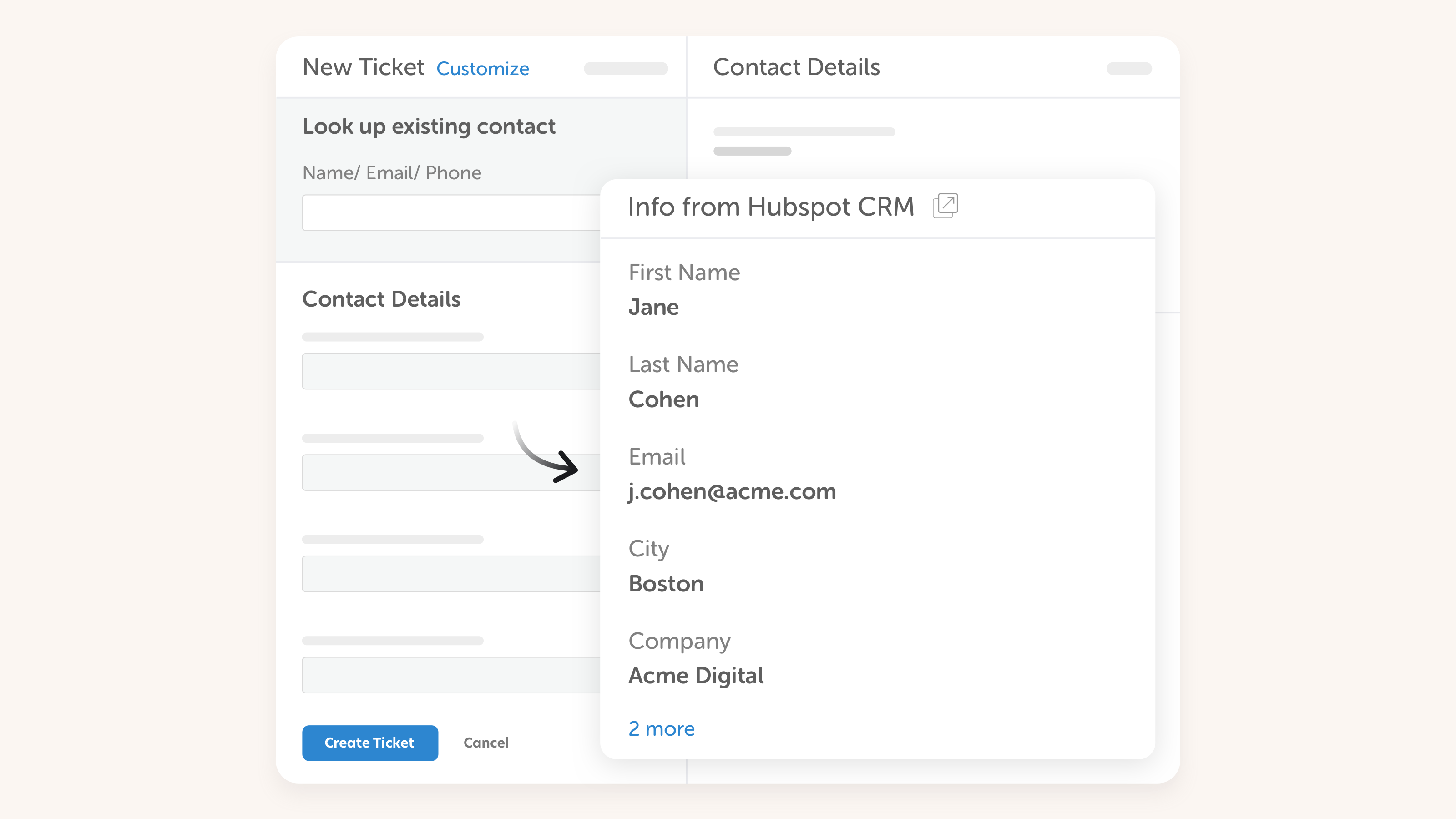 1. Access HubSpot CRM customer information within HappyFox Ticket Details Page and New Ticket Creation form.